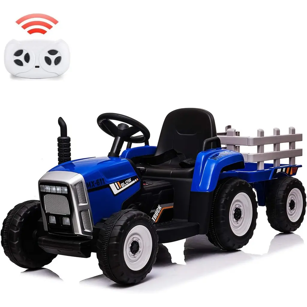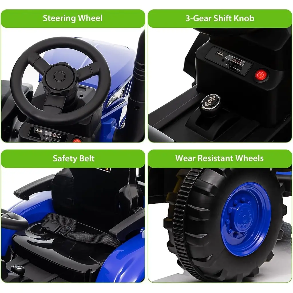 Premium Materials: This ride-on tractor is constructed from high-quality PP and iron, ensuring robust durability for long-lasting use. With its strong build, parents can trust that this vehicle will withstand the rigors of active play, providing your child with exciting adventures for years to come. Exceptional Performance: Powered by a large-capacity rechargeable battery and dual 35W motors, this toy tractor is capable of tackling various terrains, including grass, dirt, and gravel. It delivers consistent speed and power, supporting a maximum load of 66 lbs while ensuring an exhilarating ride for your child. Removable Trailer: Included with the tractor is a detachable trailer that offers additional storage for small toys and snacks. Kids can enjoy imaginative outdoor play as they transport gardening tools and supplies around the backyard or garden, expanding their play possibilities and fostering creativity. Safety and Comfort: Designed with safety in mind, this 12V ride-on vehicle incorporates adjustable seat belts, armrests, and soft-start technology to ensure a secure and comfortable ride. Its wear-resistant wheels provide a smooth driving experience, whether indoors or outdoors, and the included parental remote control adds an extra layer of safety for peace of mind. Inbuilt Entertainment: This battery-operated electric toy comes equipped with LED lights, a horn, and pre-set music to keep kids entertained during their rides. Additionally, with USB connectivity, children can play their favorite songs effortlessly, ensuring hours of fun as they cruise around in style.