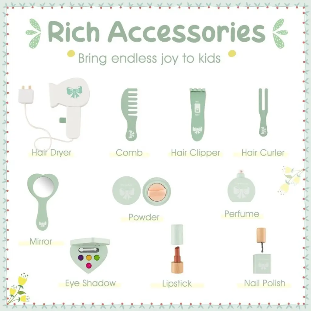 Specification: Color: White/GreenMaterials: MDF, WoodDimension of Table: 23.5" x 13" x 38.5"Dimension of Chair: 10.5" x 10" x 14.5"Total Net Weight: 20 lbsWeight Capacity of Tabletop: 110 lbsWeight Capacity of Stool: 110 lbsSuitable Ages: 3+ Years OldKey Features● Practical Mirror and Drawer: The kids vanity set boasts a safe HD acrylic tri-folding mirror which allows kids to find the perfect angle for dressing up. What's more, designed with a practical drawer, the princess vanity table holds children's various belongings. ● Safe and Stable Construction: With the anti-toppling device, you are able to fix the table to the wall for security. The strong connections and sturdy curved legs ensure overall stability. Moreover, the safe rounded corners are friendly to kids' delicate skin. ● Sweet Accessories Included: The children's vanity table and chair set comes with sweet accessories. They are a hair dryer, perfume, eye shadow, nail polish, hair curler, comb, lipstick, mirror, powder and hair clipper. And there is a simulated socket for hair dryer on the side of the vanity table. ● 2-in-1 Convertible Table: Designed with a removable mirror, this pretend play vanity table features a 2-in-1 design for different activities. On the one hand, it can be used as a vanity table for makeup. On the other hand, it serves as a writing desk for study. ● Perfect Gift for Little Girls: This vanity desk and stool set has a stylish shape and attractive patterns that appeal to kids a lot. Thus, it is a perfect gift for little princesses over 3 years old, offering them endless fun of pretend play.Overview-Vanity table with removable mirror for dual use-Anti-toppling device for tight attachment to the wall-Acrylic tri-folding mirror for safe use and clear reflection-Rich accessories bring endless joy to kids-Safe materials and stable structure for long-lasting use-Beautiful appearance injects a charming flair into the house-Ideal gift choice for little princess aged 3+ years old-Robust curved legs with firm connections for steadiness-Simple assembly to save time and energy-ASTM and CPSIA certifications for added reliability