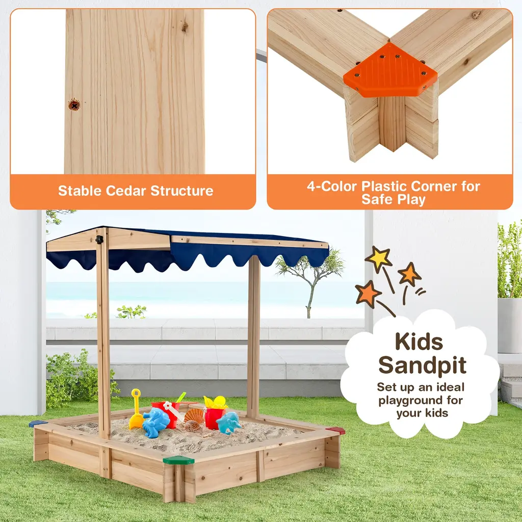 Kids Wooden Sandbox With Height Adjustable & Rotatable Canopy Playset - Natural