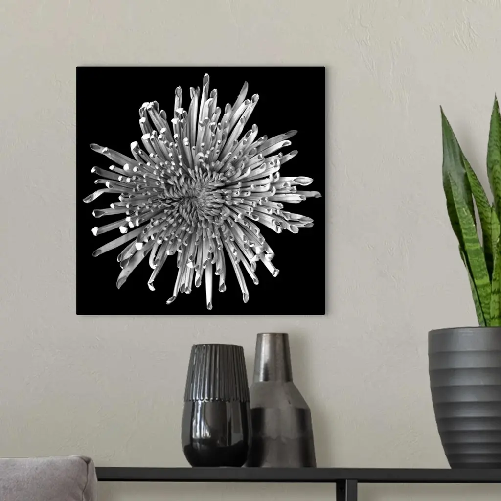 Big, square, close up photograph of a chrysanthemum that is not yet in full bloom, on a solid black background.
