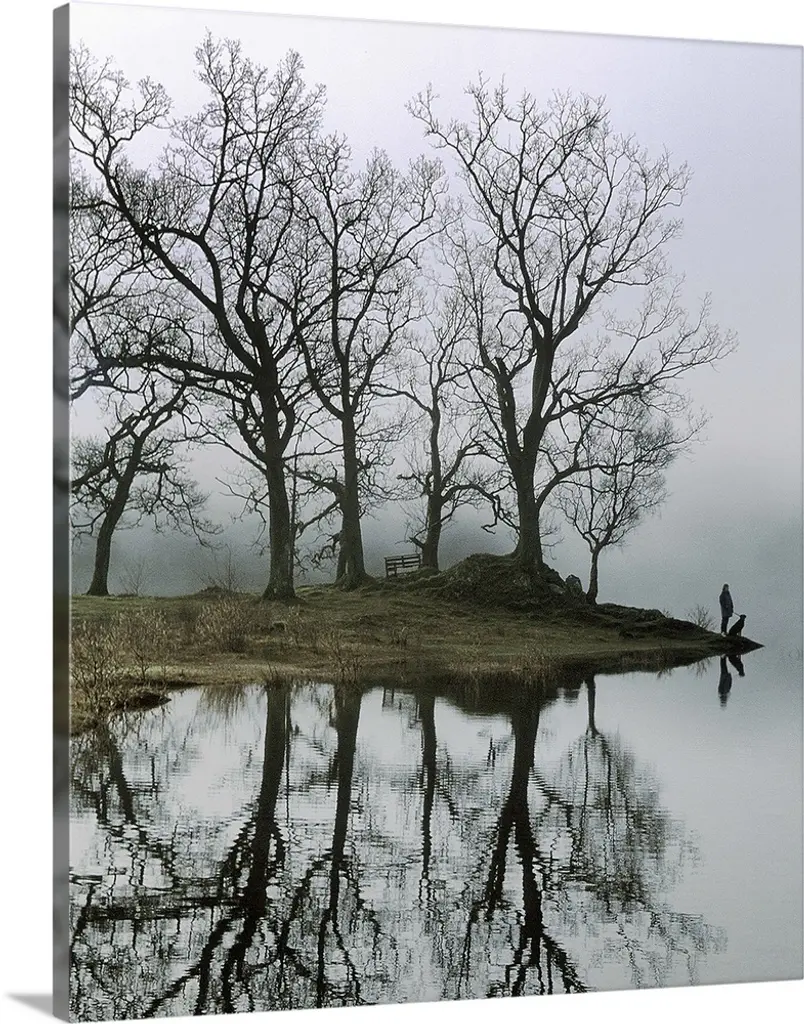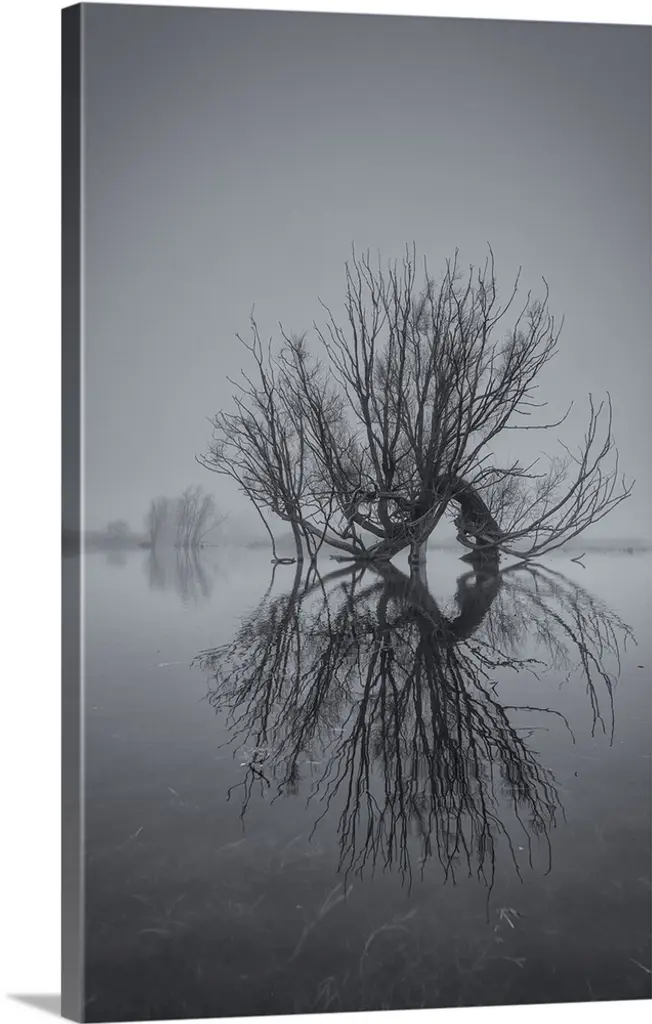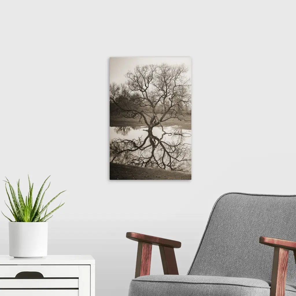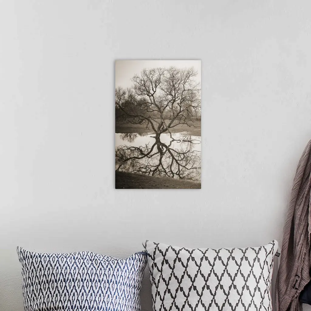 A leafless tree stands beside a calm body of water, casting an intricate reflection on the surface. The sepia tones create a nostalgic and serene atmosphere, emphasizing the stark beauty of nature in winter.