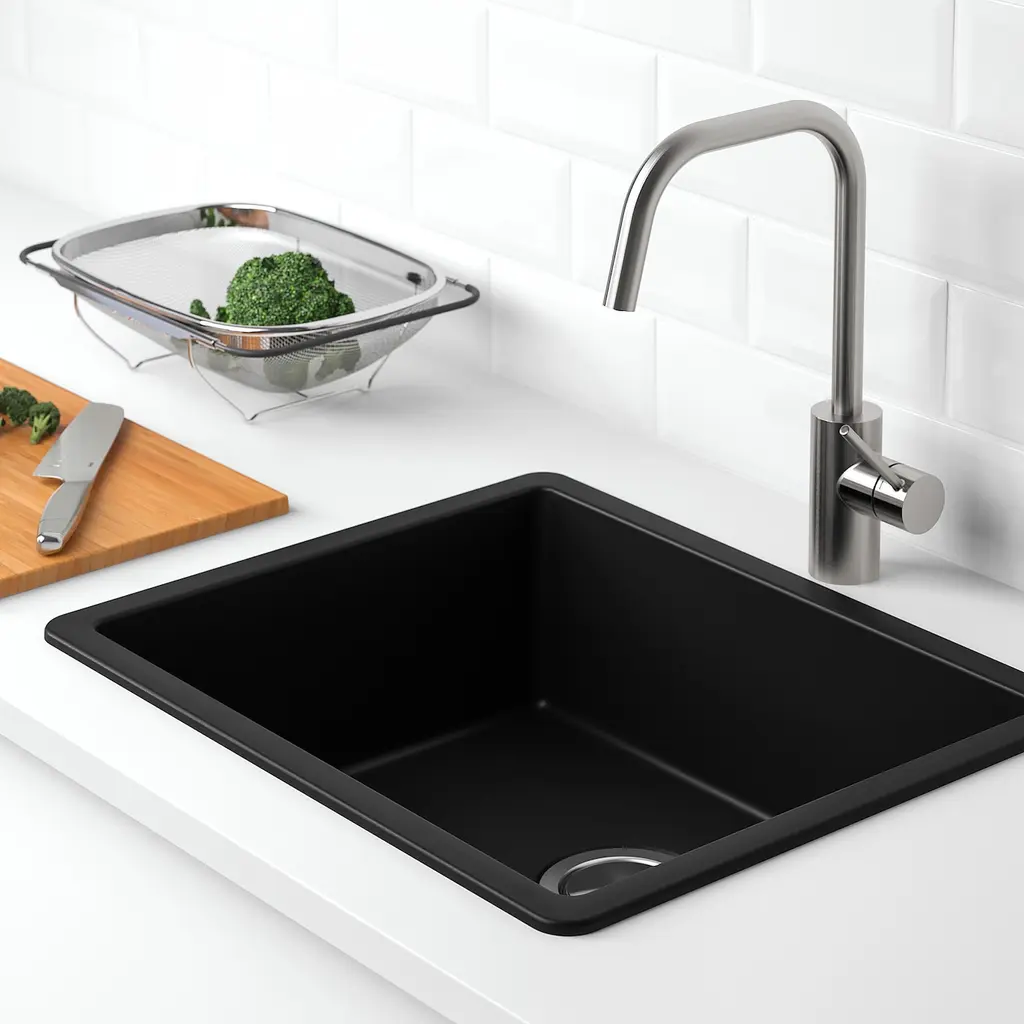 KILSVIKEN Sink - black quartz composite 22x18 1/8 ". The material is heat-resistant and maintains the same natural look and texture over time. The smooth, non-porous surface is stain-resistant. Very hygienic because the surface is dense and completely non-porous and dirt simply run off it.