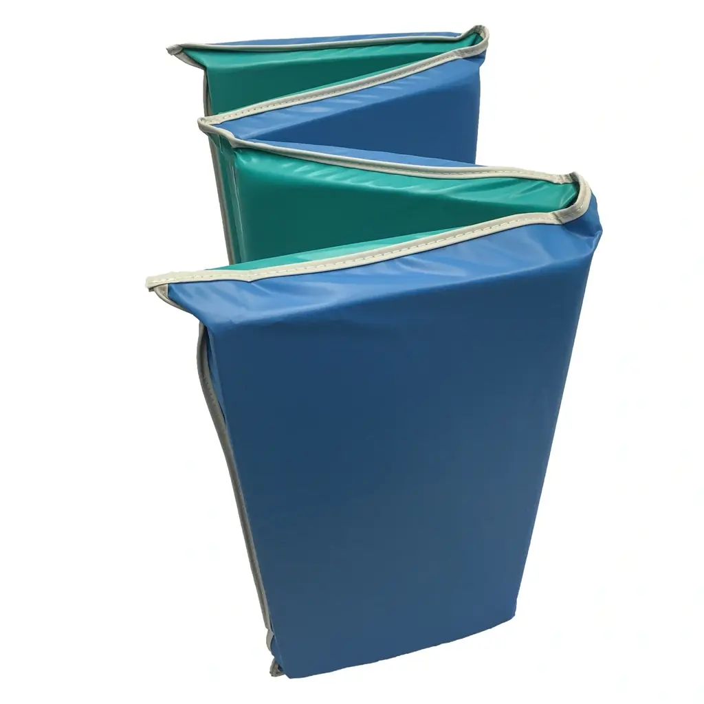 KinderMats Jr. Daydreamer rest mat is great if you are looking for a little more cushion for your kids. 44" x 19" and 2" thick. Made in Minnesota. Blue on one side, teal on the other, makes it easy to assign a side to put on the floor and a side to lay on. The tough 9 mil vinyl is water resistant and easy to clean as well as disinfect, simply wipe with warm soapy water. This mat is the perfect option for school, daycare, or home. Easy to store in a cubby or on the go with the tri-fold four section measuring to 8" x 11" x 19". An added touch to this mat, the gray binding provides extra strength and durability on the edges.