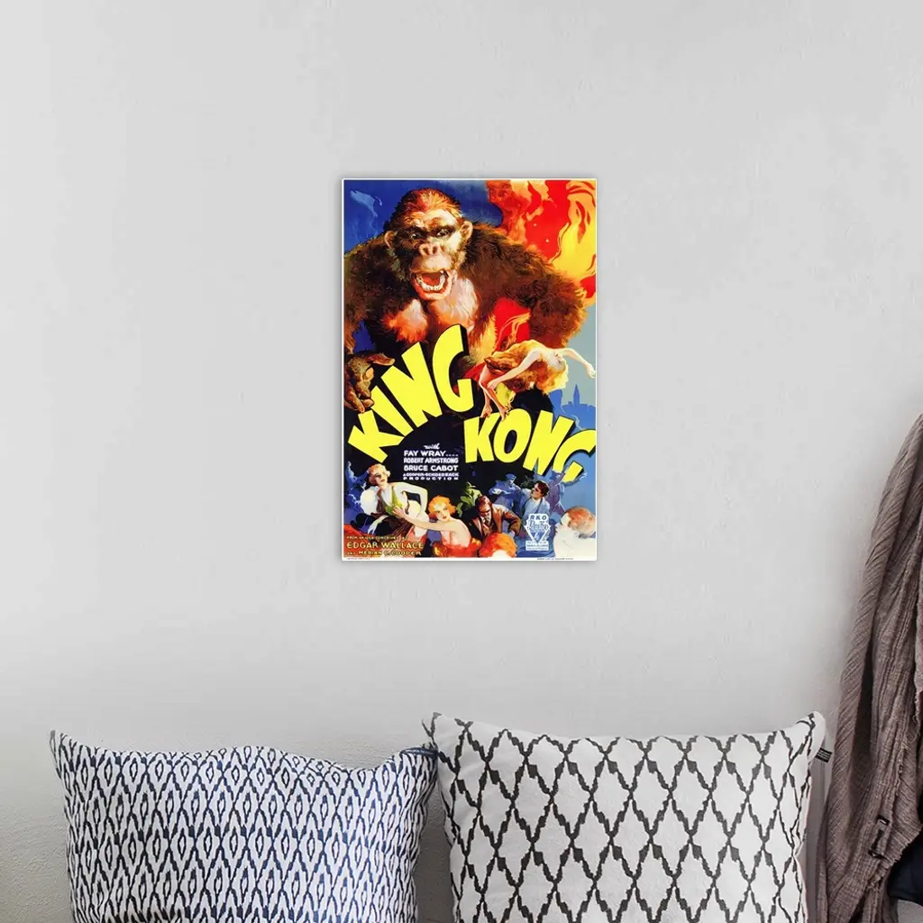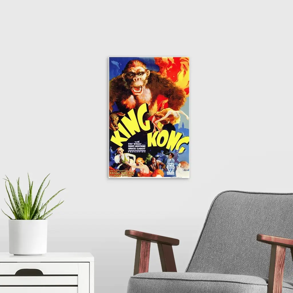 Poster for the 1933 movie King Kong. It shows King Kong towering over people at the bottom of the poster while he is holding the lead actress in the movie.