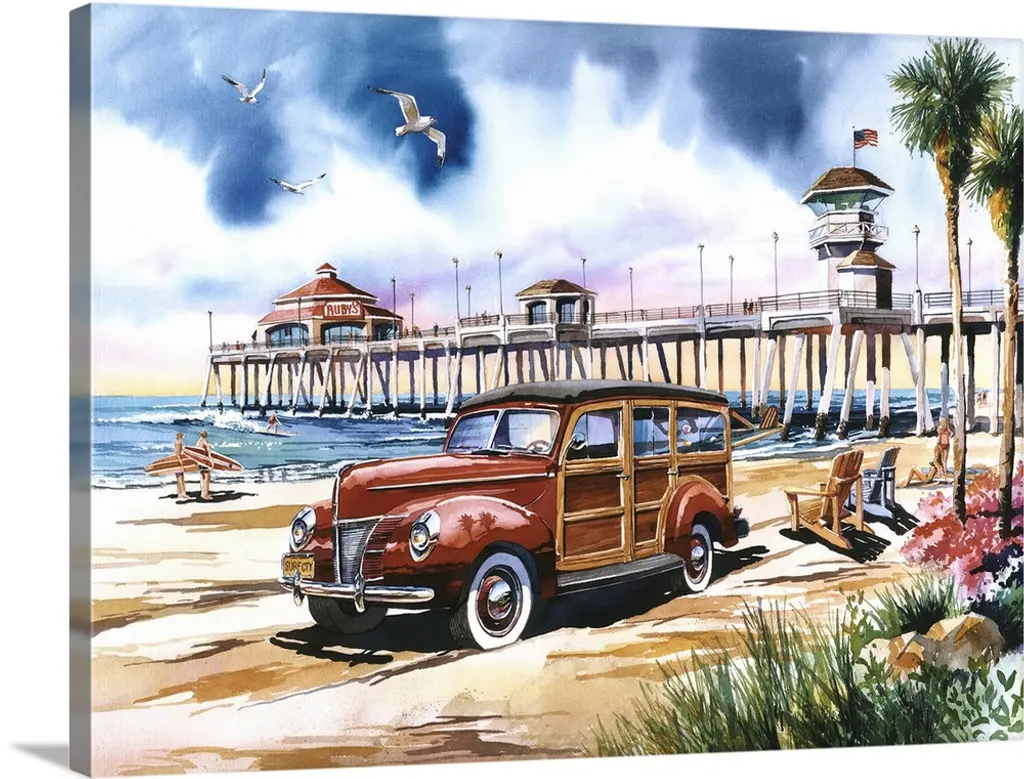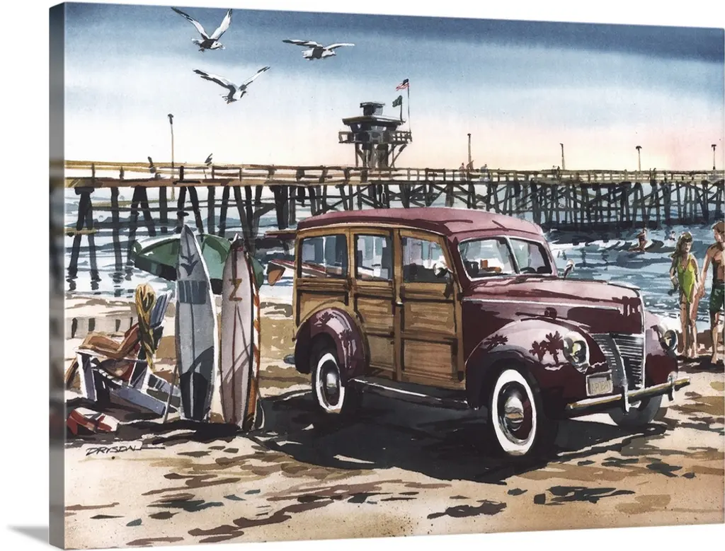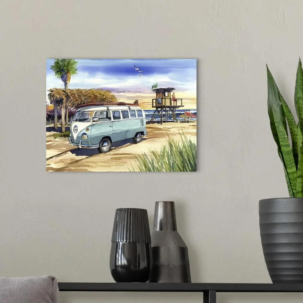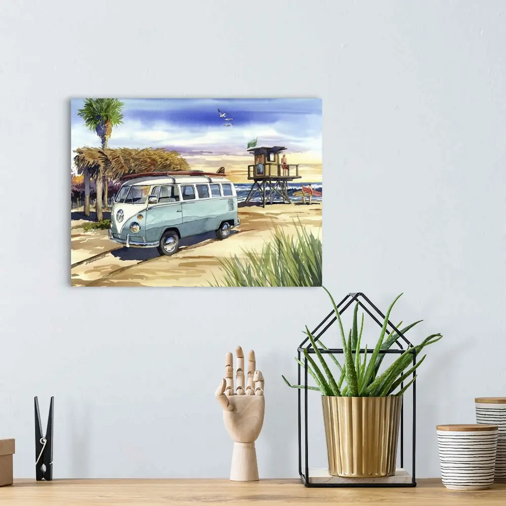 Watercolor of a classic 1967 VW Bus pulled up on the sand at the famous surfing beach, Old Mans, San Onofre, CA