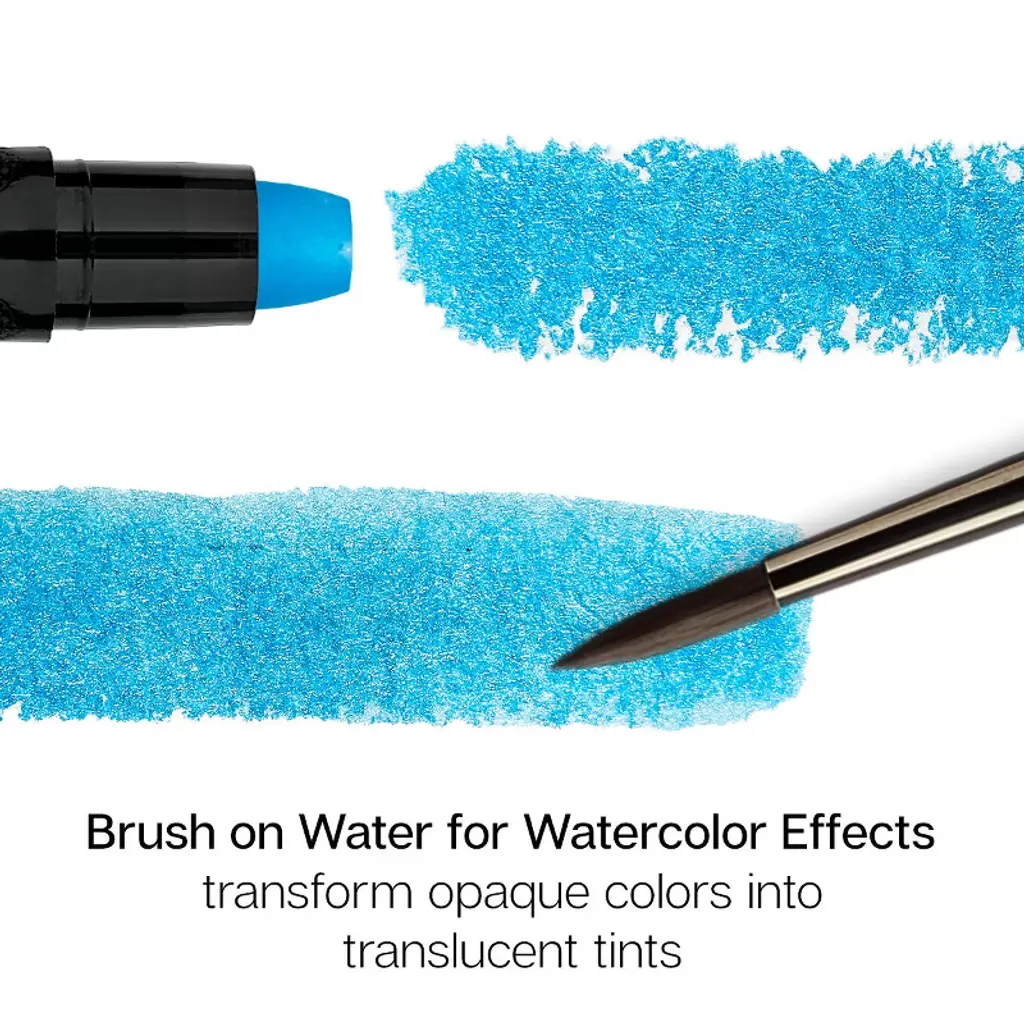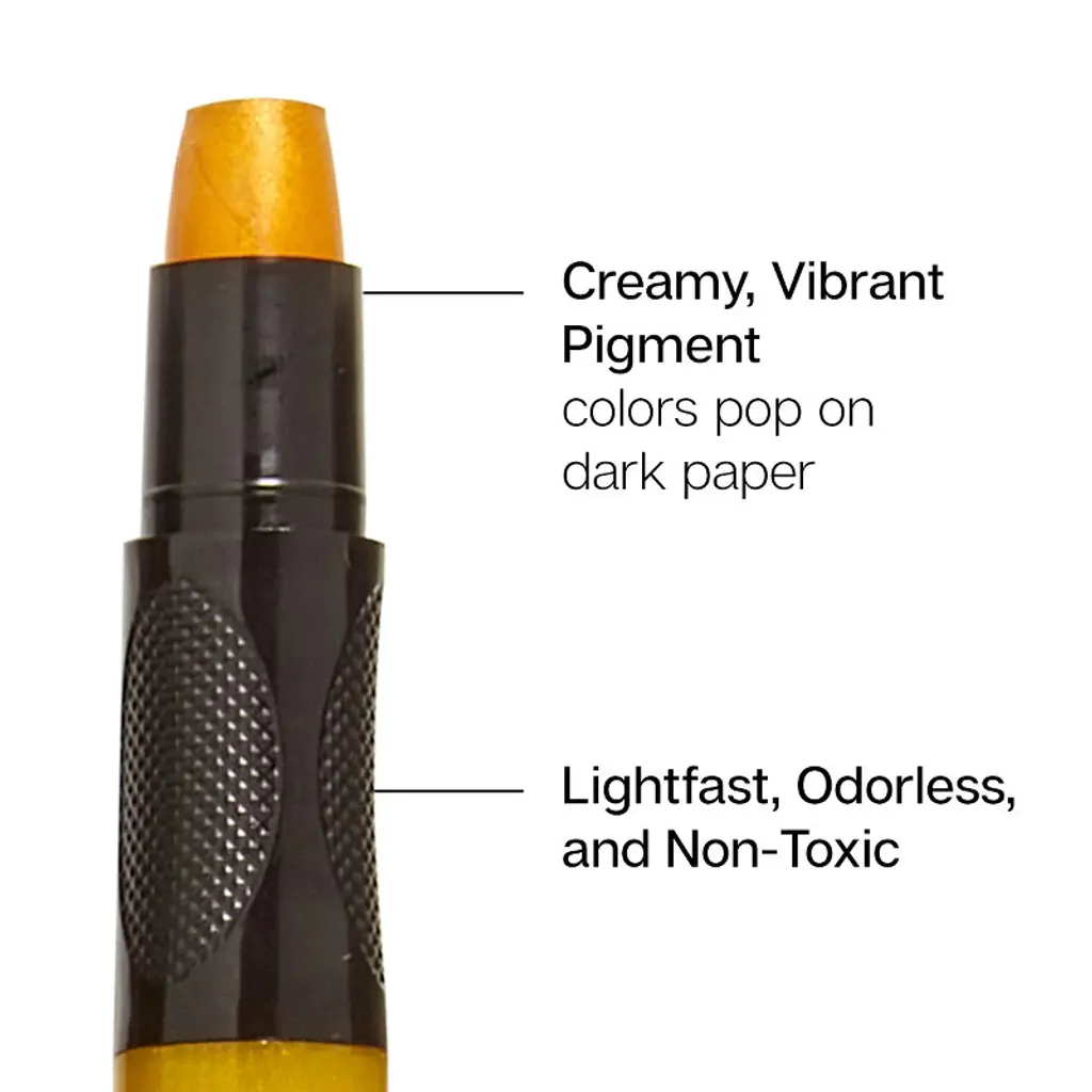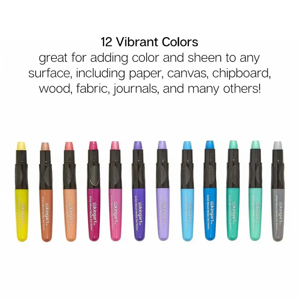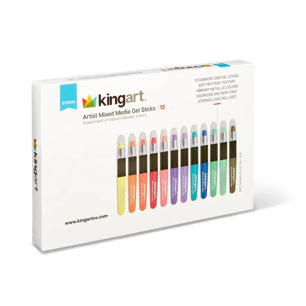 KINGART® Mixed Media Gel Stick Crayons | Set of 12 Unique Metallic Colors 12 Vibrant Metallic ColorsCreamy, Vibrant pigmentMetallic colors pop on dark paperWater-SolubleMixed Media pigment sticks Transform opaque colors into translucent tints or mists with waterBlend easily with or without waterWork well on virtually any porous surfaceBrush on water to create watercolor effectsUse on paper, wood, or canvasGreat for adding color and sheen to any surface, including paper, canvas, chipboard, wood, fabric, ribbon, journal boards, and many others!Light, fast, odorless, and non-toxicIncludes Sturdy and Convenient Storage Case Compact acid-free pigment sticks glide on creamy smooth for vibrant color and coverage. All KINGART® Gel Stick Crayons blend easily with or without water. Try this unique medium on paper, canvas, or wood and they look incredible on dark paper. These 12 mixed media gel sticks are perfect for aspiring enthusiasts and beginners looking to enjoy new levels of creativity. This set includes the following colors: Silver, Gold, Metallic Red Orange, Metallic Copper, Metallic Dark Pink, Metallic Pink, Metallic Light Purple, Metallic Purple, Metallic Dark Blue, Metallic Blue, Metallic Dark Green, and Metallic Green. The KINGART® Heritage Our family has been exceeding the needs of the most demanding artists and enthusiasts for three generations. We delight in challenging the status quo and putting our experience to work for you.