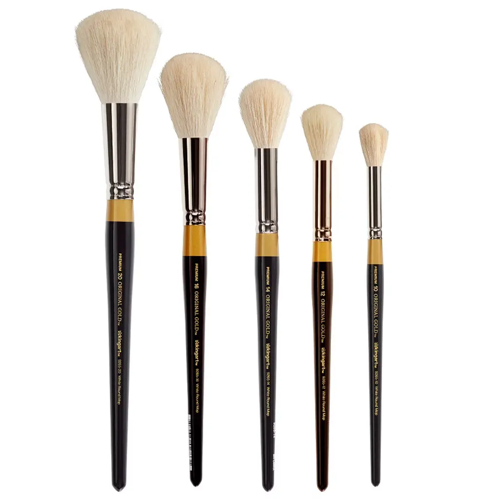 Original Gold® Premium 9265 Series 5 pc. Round Mop Brush Set, White Synthetic Hair, Short Handle Short, balanced hard-wood handles with 3 coats of black enamel paint and a distinctive gold band and serve as an extension of the hand. Seamless, nickel-plated brass ferrules are double-crimped for a secure hold.Set of 5, Series 9265 sizes: 10, 12, 14, 16, 20.Long lasting; Animal / vegan friendly. Set of 5 Sizes: 10, 12, 14, 16, 20 for Oil, Acrylic, Watercolor and Gouache Paint Perfect for use with acrylics, oil, gouache, watercolor, inks, or other media of choice! Round Mop brushes are desirable for softening and blending value transitions in oil and acrylic paint and can also be used to paint washes of color with watercolor and other light media. These round mop brush heads have a beautiful dome shape with enough body for control and finesse, with a softness to enhance looser techniques when desired. Pro Tip: Conservators appreciate soft, flexible mop brushes for dusting archival items and you'll find them in many make-up bags too! Key Features: · Perfect for blending and softening color, smoothing gradations and brush strokes, creating background color or sky washes, multi-media projects, conservators and make-up artists. · Use on smooth to lightly textured surfaces including canvas, paper, wood, metal, fabric, and more. · Hand-shaped from fine, white synthetic filament specially refined for fullness and softness. · Note: This set is not gift-boxed. About KINGART® Original Gold Brushes Whether you're a seasoned professional, or just learning to paint, your brush is a tool and KINGART Original Gold brushes are designed to enhance your creative experience. Backed by generations of brush development and manufacturing expertise, our Original Gold brush line offers one of the broadest selections of brush head styles and size ranges leading the art of brush making, while standing the test of time. Easily recognizable by their black handle and signature gold band at the ferrule, each brush head is designed to maximize durability, spring and color-holding capacity while offering outstanding control to the user. All brush heads are seated in seamless, nickel-plated ferrules and securely double-crimped on a painted, hardwood or acrylic style short handle for maximum durability. KINGART Original Gold® brush line includes: Original Gold® Premium Golden Taklon Brushes: Feature proprietary blends of three thicknesses of the highest quality synthetic taklon filament dyed, baked and mixed to most closely replicate the performance of natural hair in all media, while standing up to the rigors of acrylic based paints. Original Gold® Specialty Brushes: A selection of premium brushes made from custom blends of synthetic filaments and/or natural hair which may include our Original Gold filament, other synthetic filaments and bristles, and some natural hair for superior performance based on brush shape and use. These brushes include the finest flat and round mop styles, stipplers, blenders and more. When you choose KINGART Original Gold, you are choosing a excellence, designed with the artist in mind and crafted to provide you with years of loyal service. The KINGART® Heritage Our family has been exceeding the needs of the most demanding artists and enthusiasts for three generations. We delight in challenging the status quo and putting our experience to work for you because Art is for Everyone. KINGART – No Rules. Just Art.