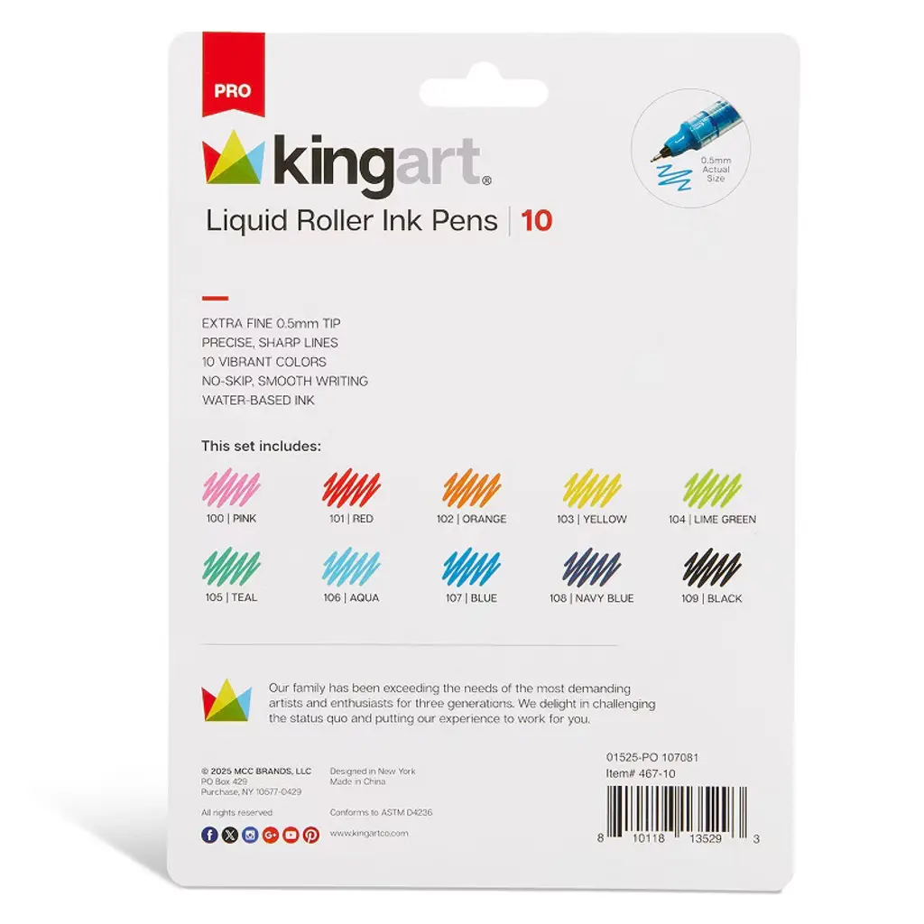 KINGART® PRO Liquid Roller Ink Pens, 10 Vibrant Colors, Extra Fine Tip Extra Fine 0.5mm Tip10 Vibrant, Vivid & Clear ColorsPrecise, Sharp LinesNo-Skip, Smooth WritingColor Coded Caps Water-Based InkGreat for art, illustrations, doodling, journaling, lettering, calligraphy and more. Non-Toxic Conforms to ASTM D4326 Enjoy endless creativity with our Pro Liquid Roller Ink Pens. The extra fine 0.5mm tip is perfect for smooth writing, detail work, and crisp clean lines. Colors Include: Pink, Red, Orange, Yellow, Lime Green, Teal, Aqua, Blue, Navy Blue, Black The KINGART® Heritage Our family has been exceeding the needs of the most demanding artists and enthusiasts for three generations. We delight in challenging the status quo and putting our experience to work for you.