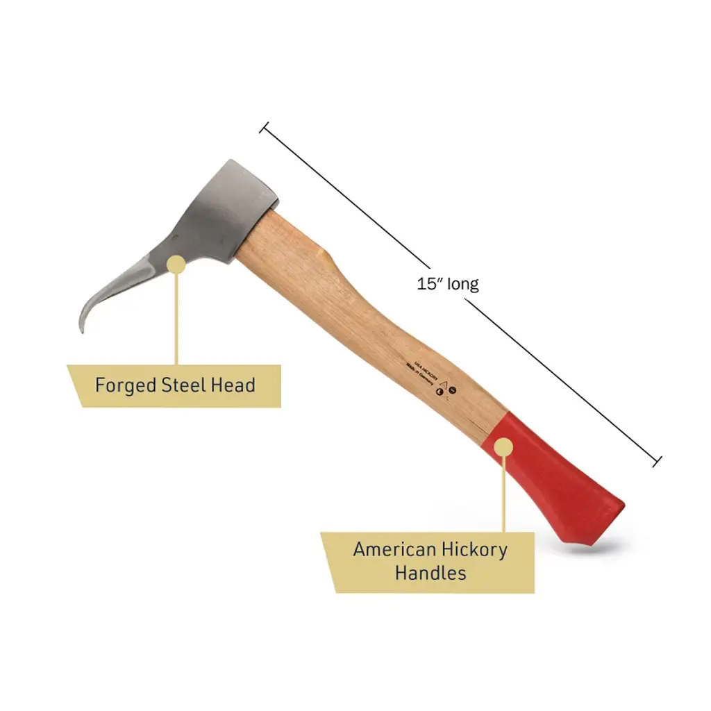 Safely move log rounds with less back strain using the 15-Inch Pickaroon Log Grapple by Kings County Tools. The steel head of this pickaroon logging tool is forged in a third-generation German foundry, with a beak-like curved precision point that is easy to drive into wood with just a slight swing. The handle of the log grabber is made of durable hickory wood, and provides the leverage you need wrangle logs with ease. Kings County Tools is your source for bushcraft tools, arborist equipment, and chainsaw accessories that deliver quality you can count on for all your logging and yard maintenance needs.