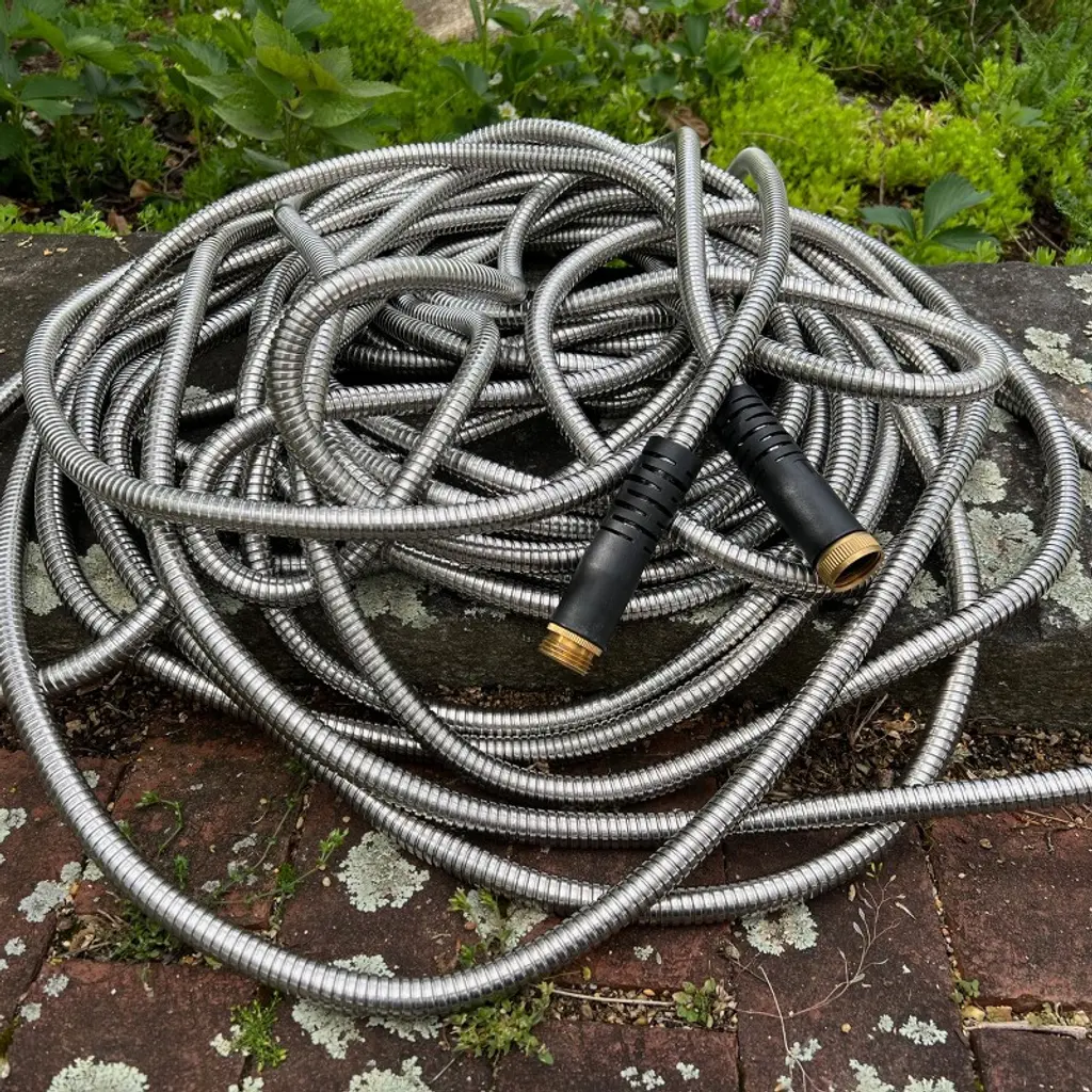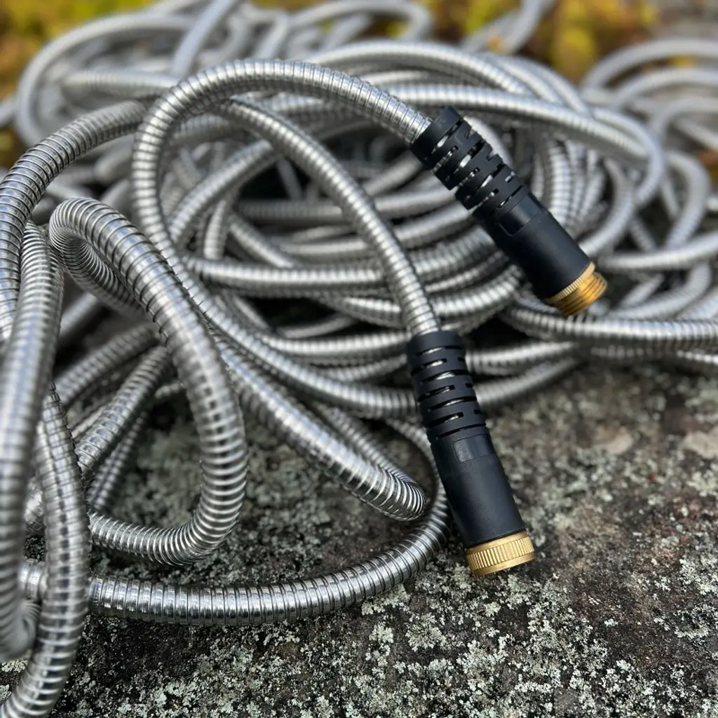 Take the hassle out of lawn watering with the ultra-durable Stainless Steel Garden Hose 75 ft Kink Free Hose by Kings County Tools. This heavy duty hose is puncture-proof, tear-proof, and crack-proof, with a stainless steel exterior that is impervious to animal bites, corrosion, or rust. This steel reinforced hose weighs only 7.68-pounds, with a flexible yet kink-proof design that can be maneuvered around corners with ease. Kings County Tools is your source for heavy duty garden hoses and other gardening supplies and lawn care equipment with quality you can trust. Note: This outdoor hose is not intended for drinking water, and a nozzle is NOT included.