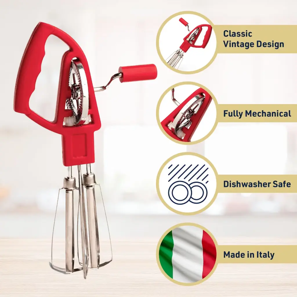 Whether you’re whipping up a tasty batch of whipped cream or mixing up a scrumptious egg dish, our Manual Egg Beater by Kings County Tools has you covered. This hand crank mixer old fashion is made of durable stainless steel for long-lasting use with two heavy duty beaters for efficient mixing and a hard polymer plastic handle, providing you with a secure and comfortable hold while blending. Unlike heavy and bulky electric hand mixers, our hand egg beater whisk tool is small, making it easy to store in any drawer or cabinet, with a simple design, so you don’t need to go looking for attachments or an open outlet; the only thing you need is your hands.