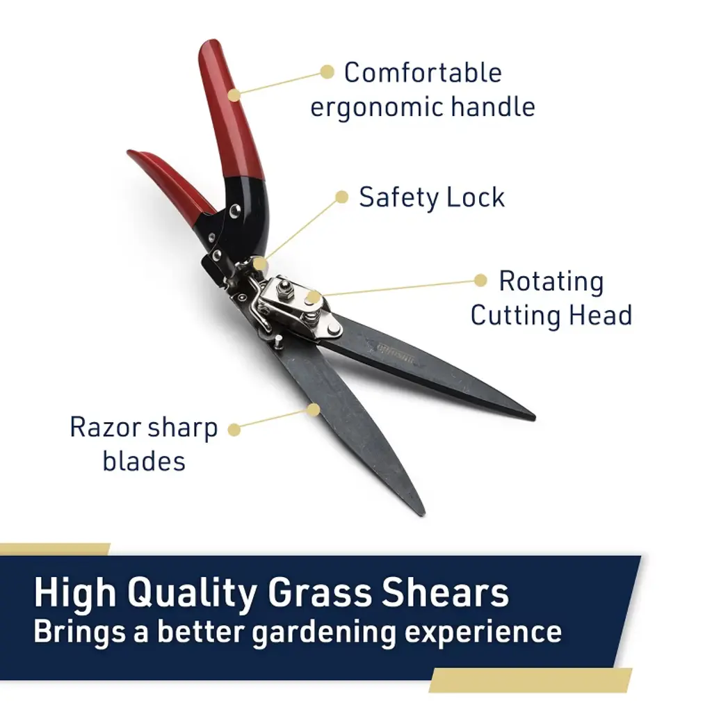 Achieve the perfectly manicured lawn of your dreams with the Grass Clippers Handheld Shears by Kings County Tools. With strong alloy steel blades and comfortable coated plastic handles, these hand trimmers for grass make it easy to precisely trim areas where grass grows right up to the edges and for shaping small hedges. The handles of these grass clippers rotate in 3 positions for multiple cutting angles, to tackle a variety of lawncare and landscaping tasks with precision. Kings County Tools is your source for grass clippers & shears with quality you can trust.