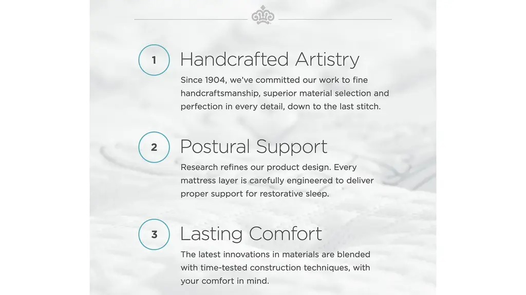 For those who prefer plush comfort, the Kingsdown Graylyn Plush Eurotop will not disappoint. With innovative features engineered to maximize comfort and reduce partner disturbance, this model will leave you feeling refreshed and ready to take on the day. Tri-zoned, individually wrapped coils are topped with gel-infused comfort layers for unsurpassed comfort, night after night. HANDCRAFTED EXCELLENCE AND UNDENIABLE COMFORT SINCE 1904. For over a century, the Kingsdown name has been synonymous with unprecedented quality. Every detail is considered, and we ensure superior material selection and perfection, right down to the last stitch of our renowned tailoring. Handcrafted in the United States, each mattress is tested and certified before it leaves our hands to ensure consistent, superior quality and accurate, refined support. Since 1904, weve never compromised on comfort, and neither should you.