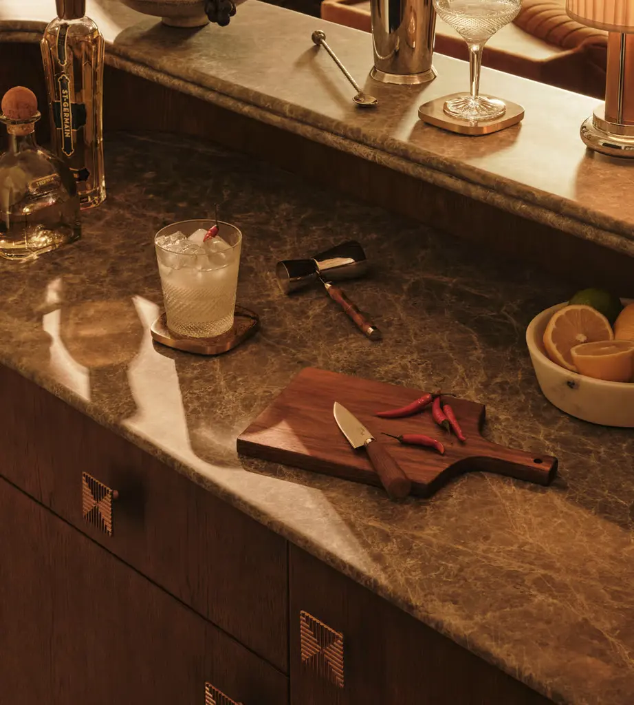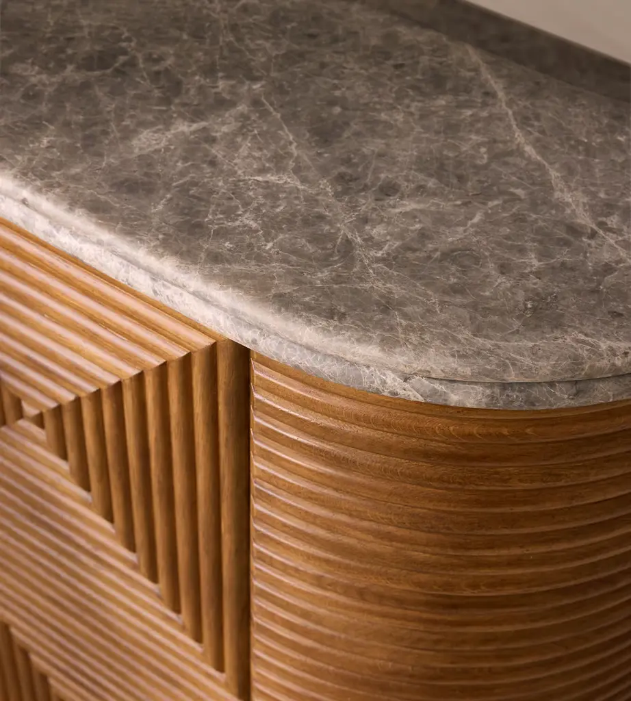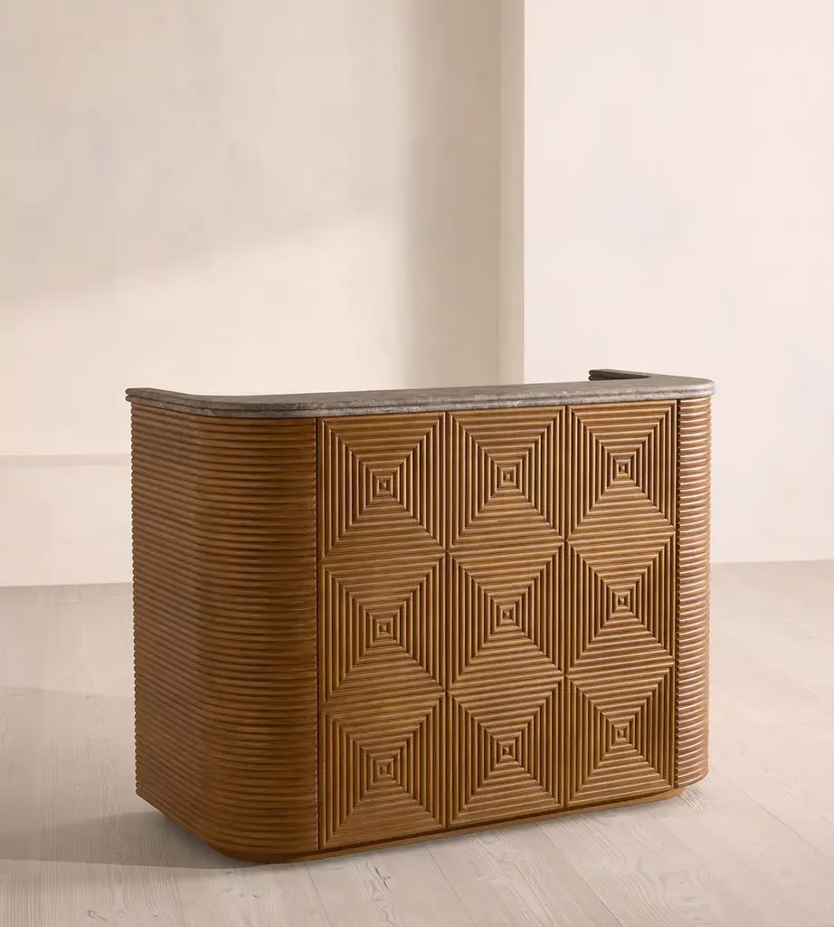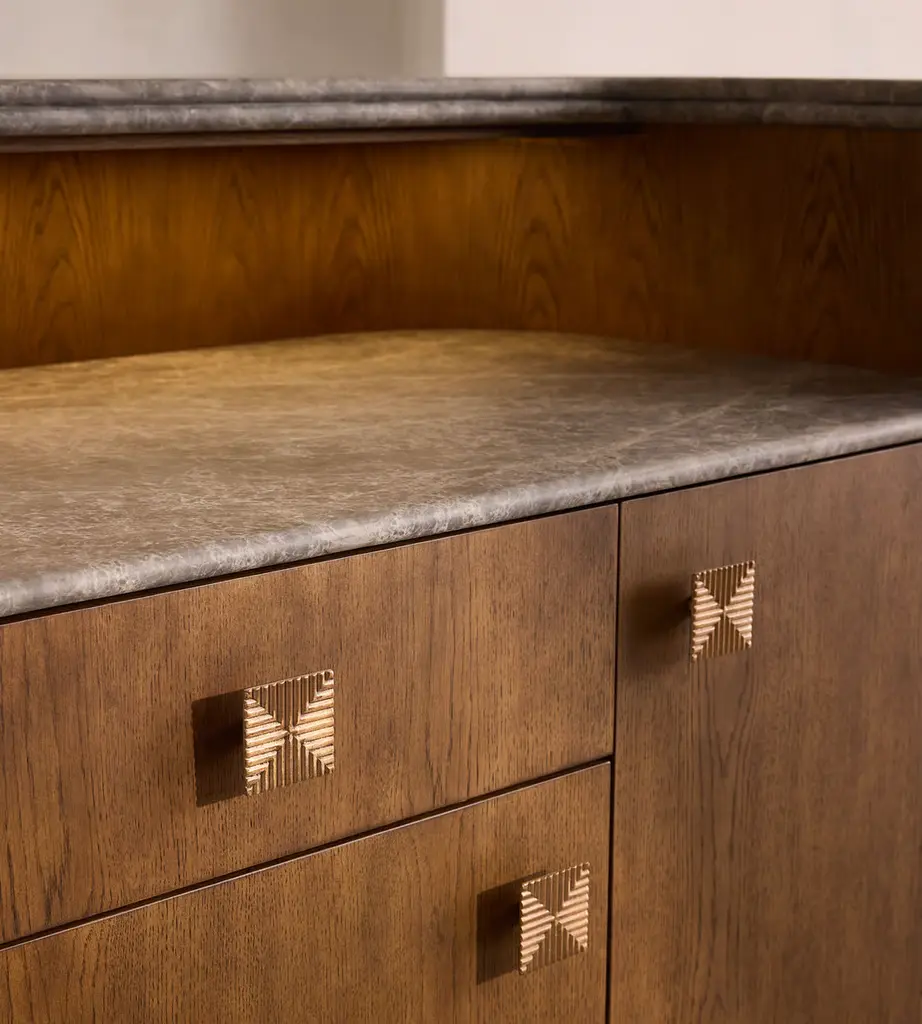 Crafted from solid oak, this unit is accented with diamond-shaped engravings and a honed grey Emperador marble top and shelf. The geometric design on the Kingsley bar references the bar at Soho House Nashville. Crafted from solid oak, the design features a drawer and three doors with handles and hanging glass storage in an antique brass finish, plus wine storage and adjustable shelves.