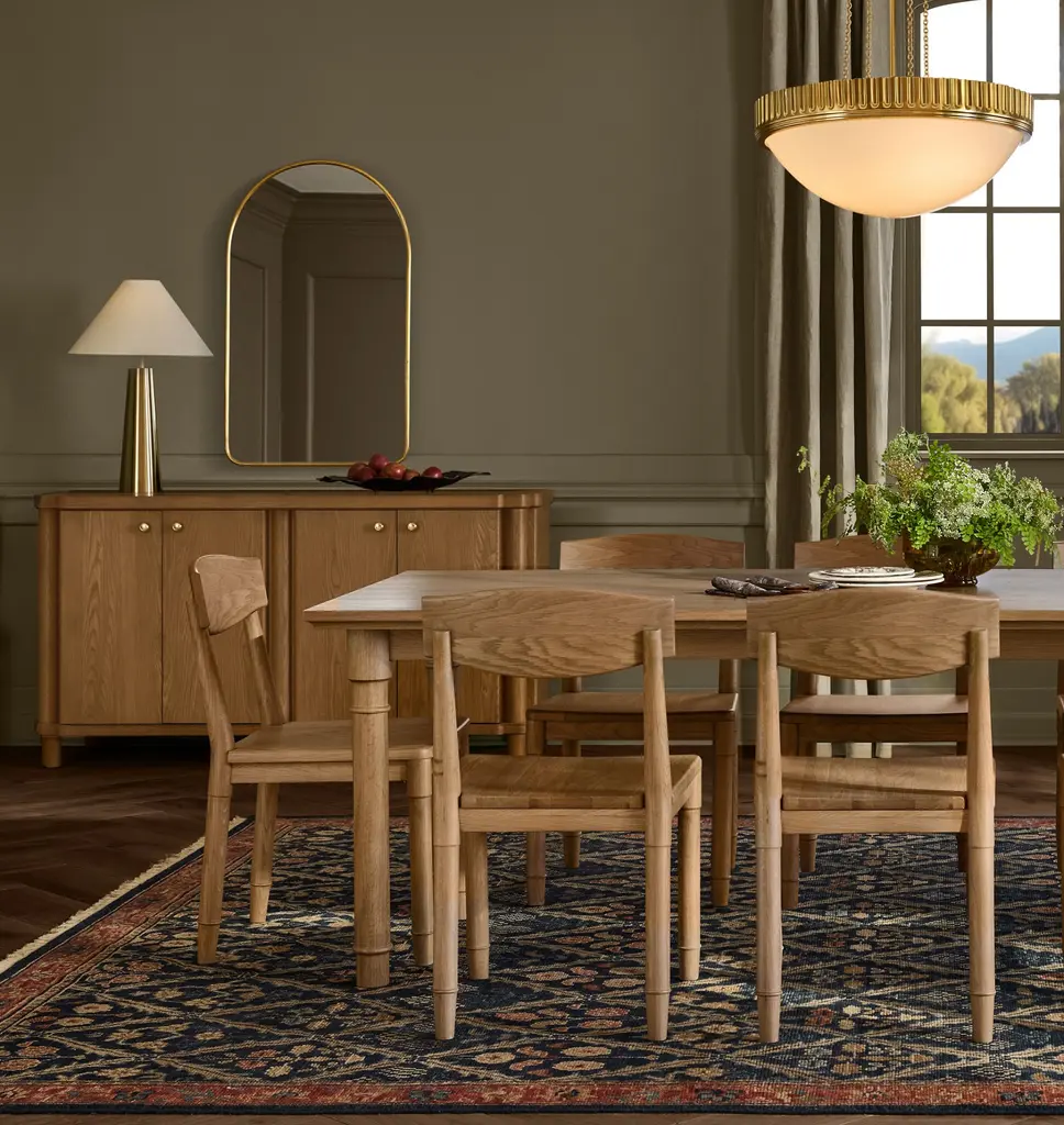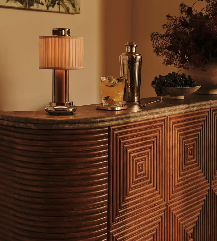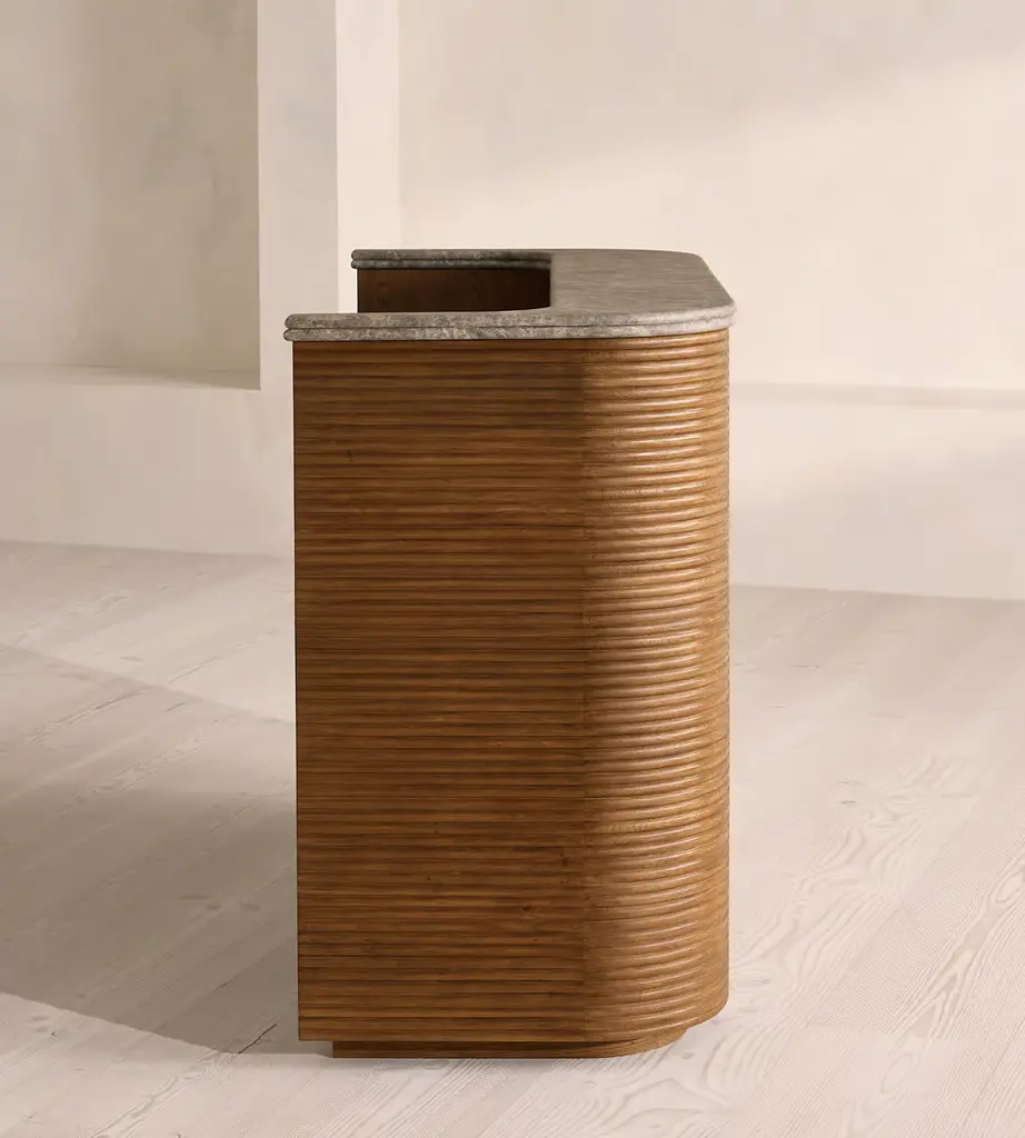 Crafted from solid oak, this unit is accented with diamond-shaped engravings and a honed grey Emperador marble top and shelf. The geometric design on the Kingsley bar references the bar at Soho House Nashville. Crafted from solid oak, the design features a drawer and three doors with handles and hanging glass storage in an antique brass finish, plus wine storage and adjustable shelves.