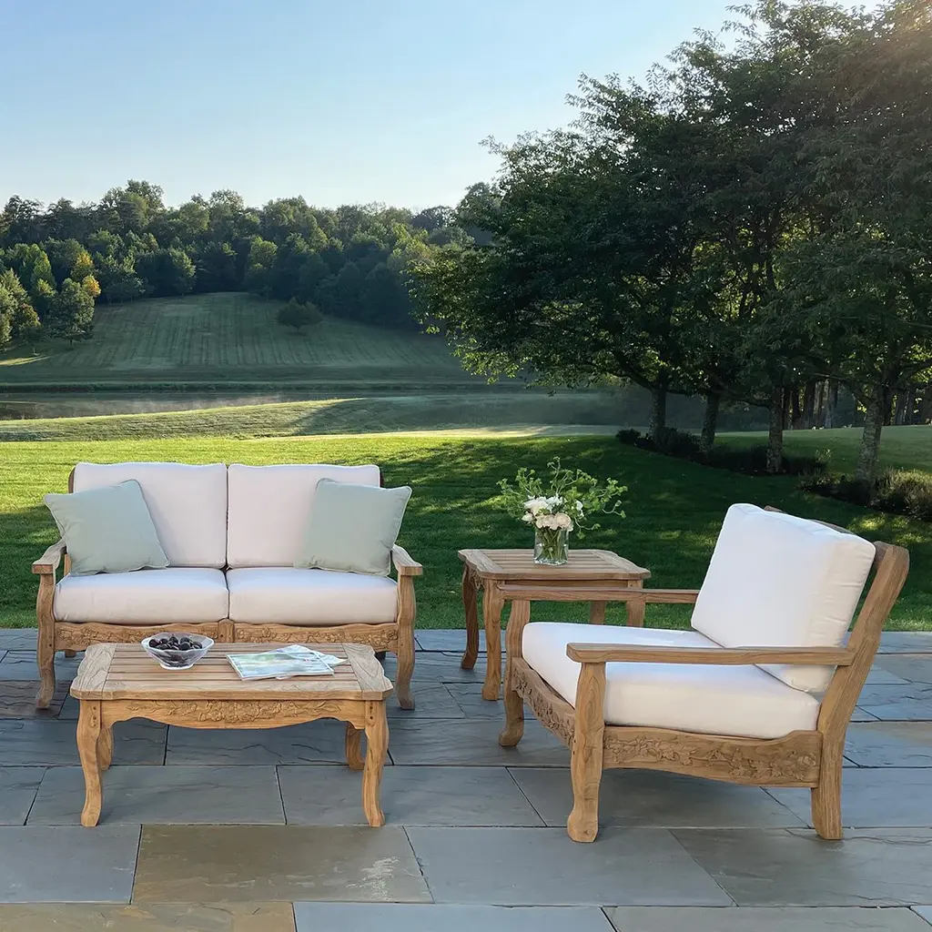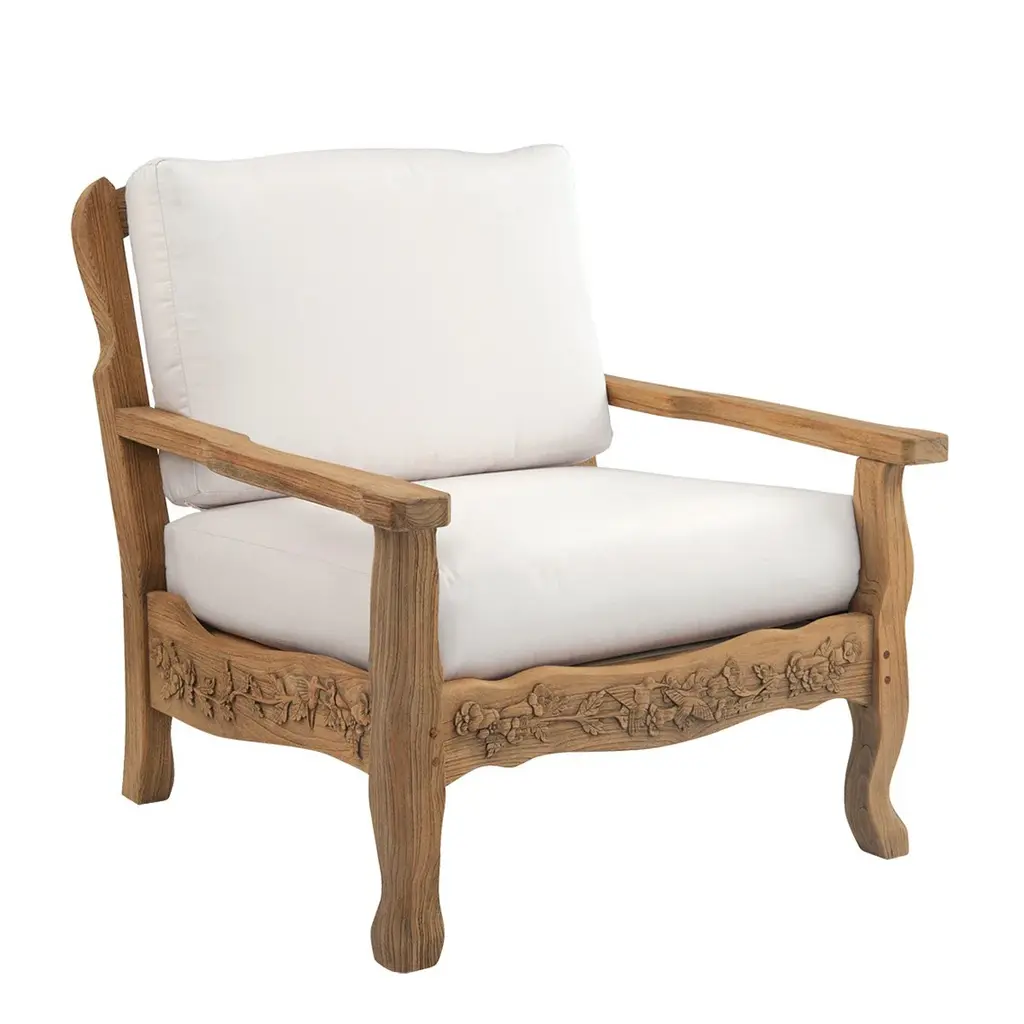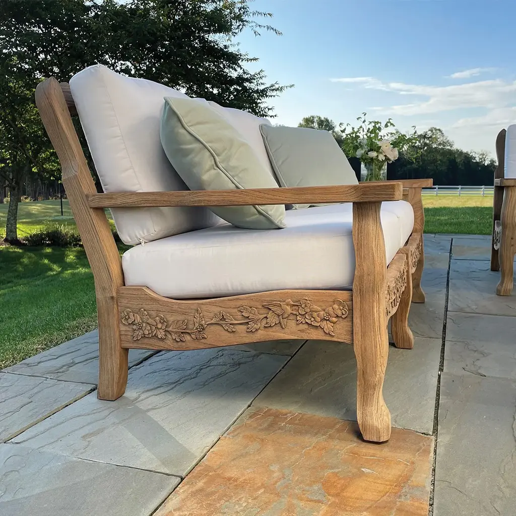 The Normandy collection is quintessential garden estate furniture sculpted from solid distressed teak. The masterful reliefs of hummingbirds and trumpet vines, hand-carved with utmost precision, pay homage to the classic French Provincial style. This collection blends comfort and elegance with weather-friendly cushions poised on sling seat decks. Fabrics Note: Additional fabric options are available upon request. Please contact us for a quote: 800-762-5374 or customercare@frontera.com. Please Note: Kingsley Bate fabrics, canopies, cushions, covers, special order sling colors, and special order finishes are considered customized and may have longer lead times. These items cannot be cancelled, returned, or exchanged.