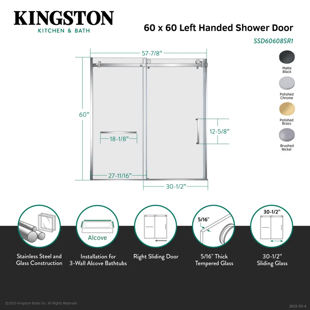 Enhance your bathroom's sophistication with the geometric elegance of the Kingston Brass Toledo Collection frameless sliding shower door. This modern masterpiece blends style and practicality. Its precision-engineered sliding mechanism ensures effortless operation, while the unique geometric patterns exude contemporary charm. Transform your shower space into a luxurious sanctuary with the enduring quality and impeccable design that Kingston Brass is renowned for.FeaturesStainless steel construction for long lasting performance5/16" (8mm) thick tempered glassOverall dimension: (L)57-7/8" x (W)2" x (H)60"Right sliding27-11/16" fixed glass30-1/2" sliding glassOne vertical bar door handleOne horizontal towel bar