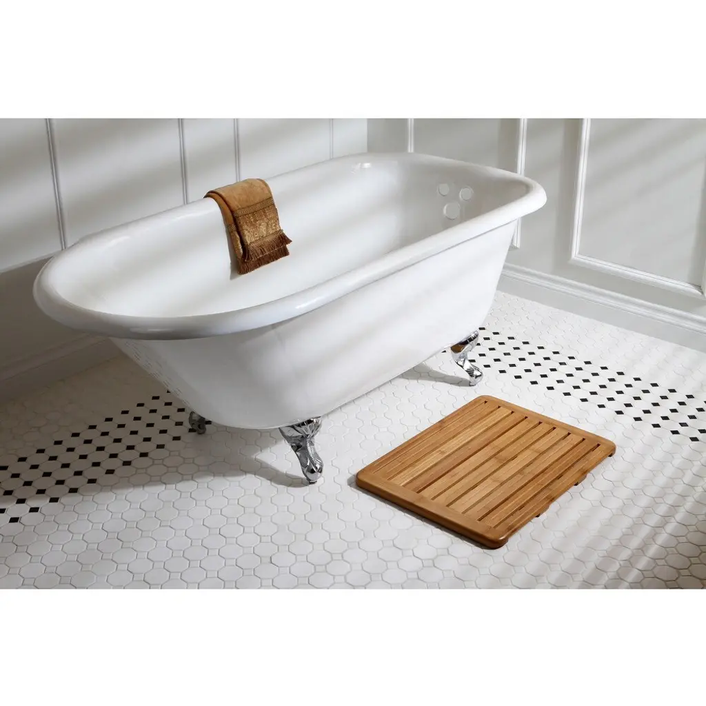 Surround yourself with the perfumed aroma of your favorite candle, grab your favorite piece of literature, and soak all of the stresses of the day away with the all-encompassing embrace of one of Kingston Brass' finest products, the clawfoot tub. Since the late 19th century, the claw foot tub has stood prominent among bathroom fixtures for its outstanding grandeur. The Aqua Eden 54-inch cast iron roll top clawfoot tub with 3-3/8-inch wall drillings will wholly beautify your home for years to come thanks to its durable and heavy cast iron construction. Elegantly crafted clawfoot tub feet are included to further elevate your home's traditional eminence. Aside from its feet, this bathtub is enameled in glossy white for a classic look, exceptional durability, and easy care and maintenance for years to come.FeaturesFabricated from high quality cast iron material for added heat retentionFreestanding installationOverall dimension: (L)54" x (W)30-1/8" x (H)24"Water depth is 11-13/16" to overflow47.6 gallon tub capacityClassical roll top designDrilled for 3-3/8" center to center faucet installationEasy tub wall mount faucet installationReversible/end drain placementBathtub finished in glossy white enamel on inside and top rim, matte white on outsideBuilt-in adjusters in tub feet for uneven floorsEagle claw & ball design