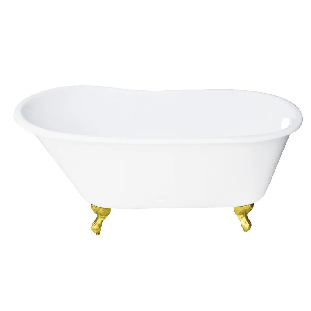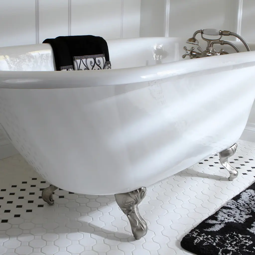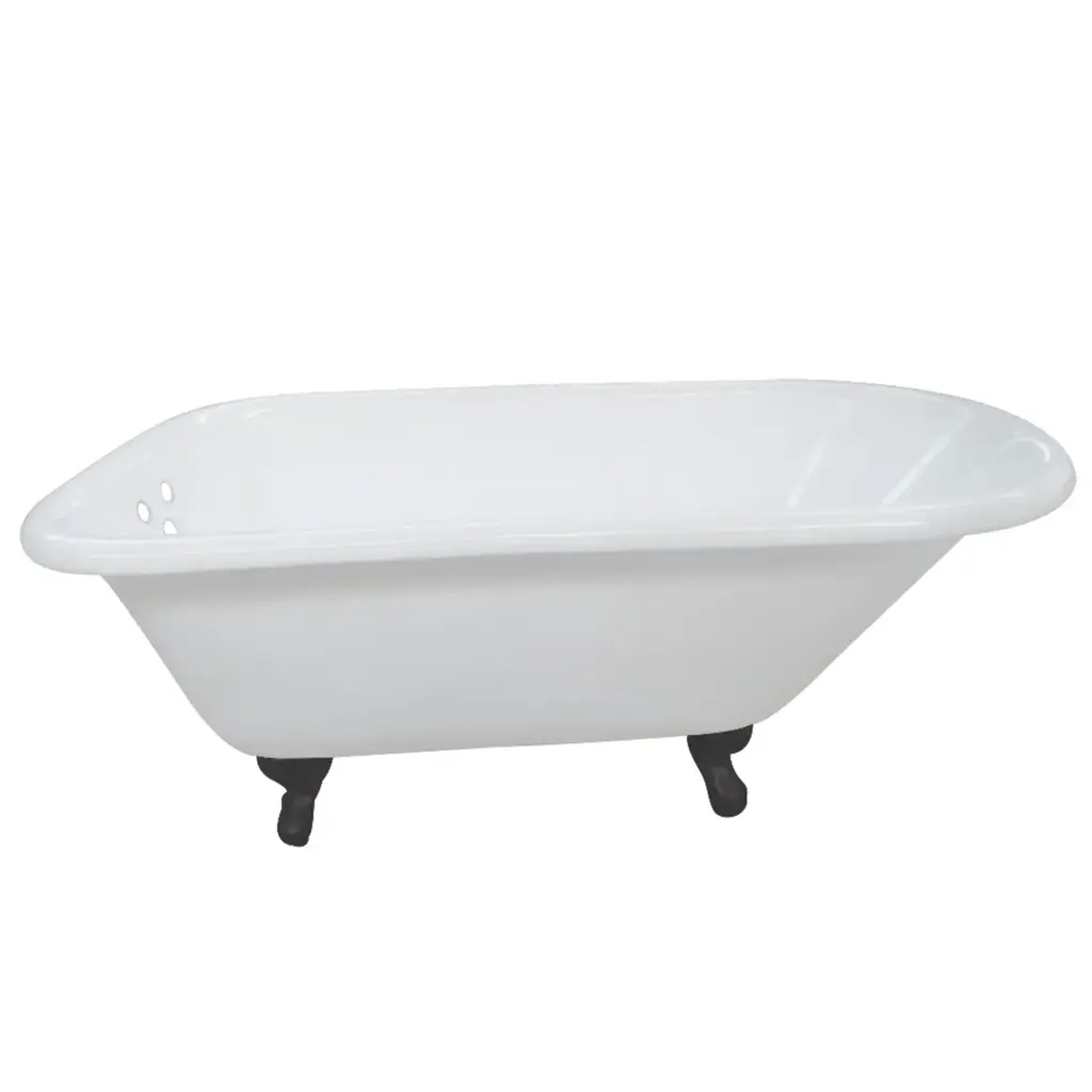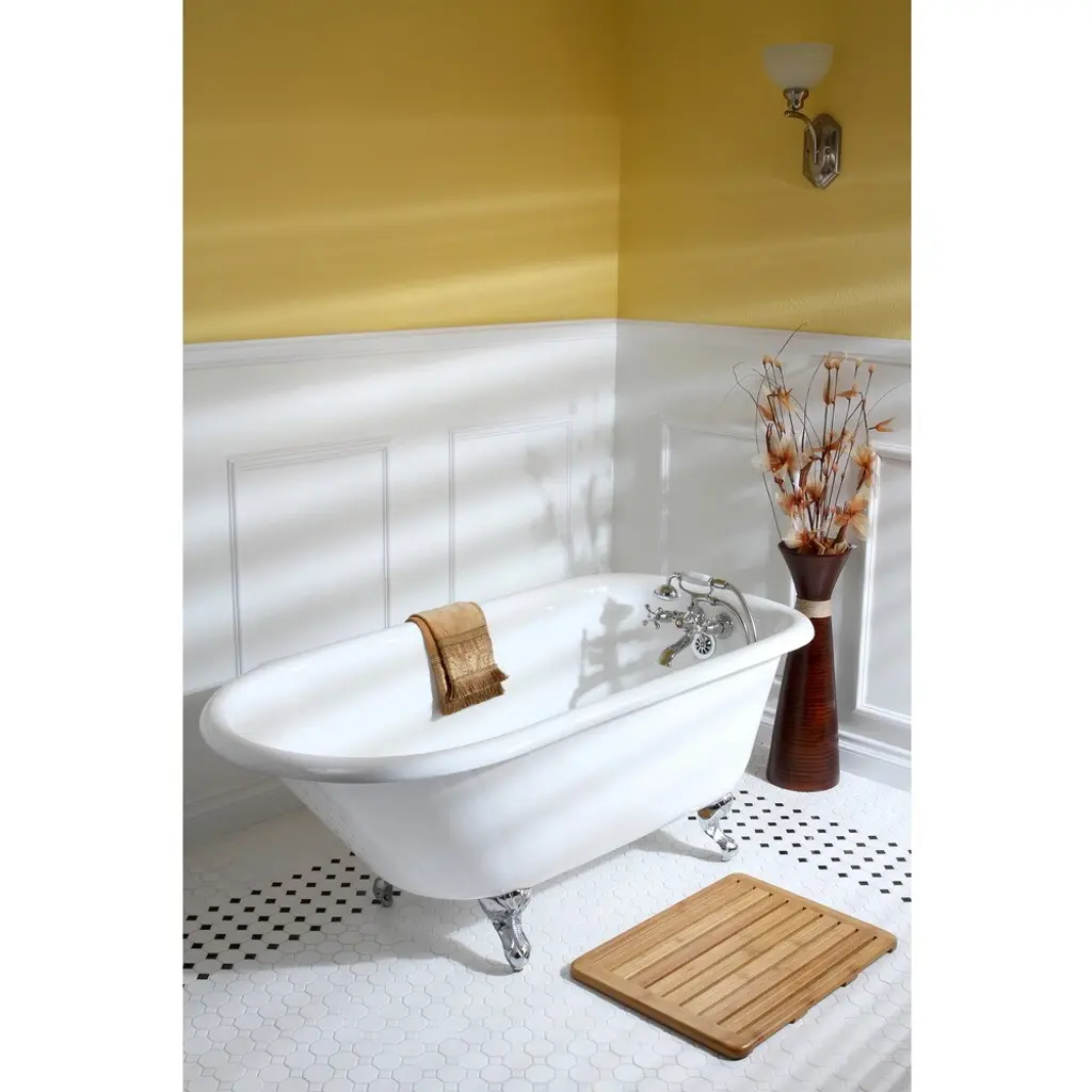 Surround yourself with the perfumed aroma of your favorite candle, grab your favorite piece of literature, and soak all of the stresses of the day away with the all-encompassing embrace of one of Kingston Brass' finest products, the clawfoot tub. Since the late 19th century, the claw foot tub has stood prominent among bathroom fixtures for its outstanding grandeur. The Aqua Eden 54-inch cast iron roll top clawfoot tub with 3-3/8-inch wall drillings will wholly beautify your home for years to come thanks to its durable and heavy cast iron construction. Elegantly crafted clawfoot tub feet are included to further elevate your home's traditional eminence. Aside from its feet, this bathtub is enameled in glossy white for a classic look, exceptional durability, and easy care and maintenance for years to come.FeaturesFabricated from high quality cast iron material for added heat retentionFreestanding installationOverall dimension: (L)54" x (W)30-1/8" x (H)24"Water depth is 11-13/16" to overflow47.6 gallon tub capacityClassical roll top designDrilled for 3-3/8" center to center faucet installationEasy tub wall mount faucet installationReversible/end drain placementBathtub finished in glossy white enamel on inside and top rim, matte white on outsideBuilt-in adjusters in tub feet for uneven floorsEagle claw & ball design