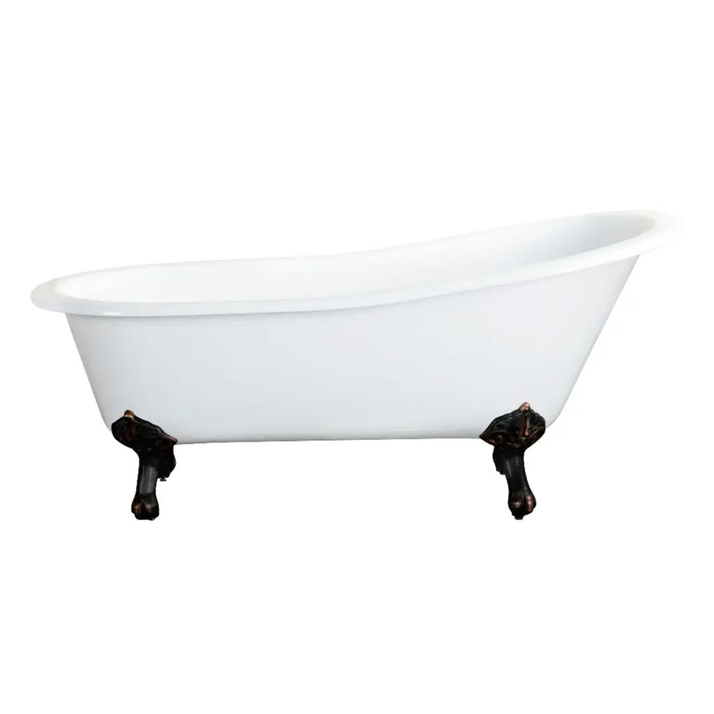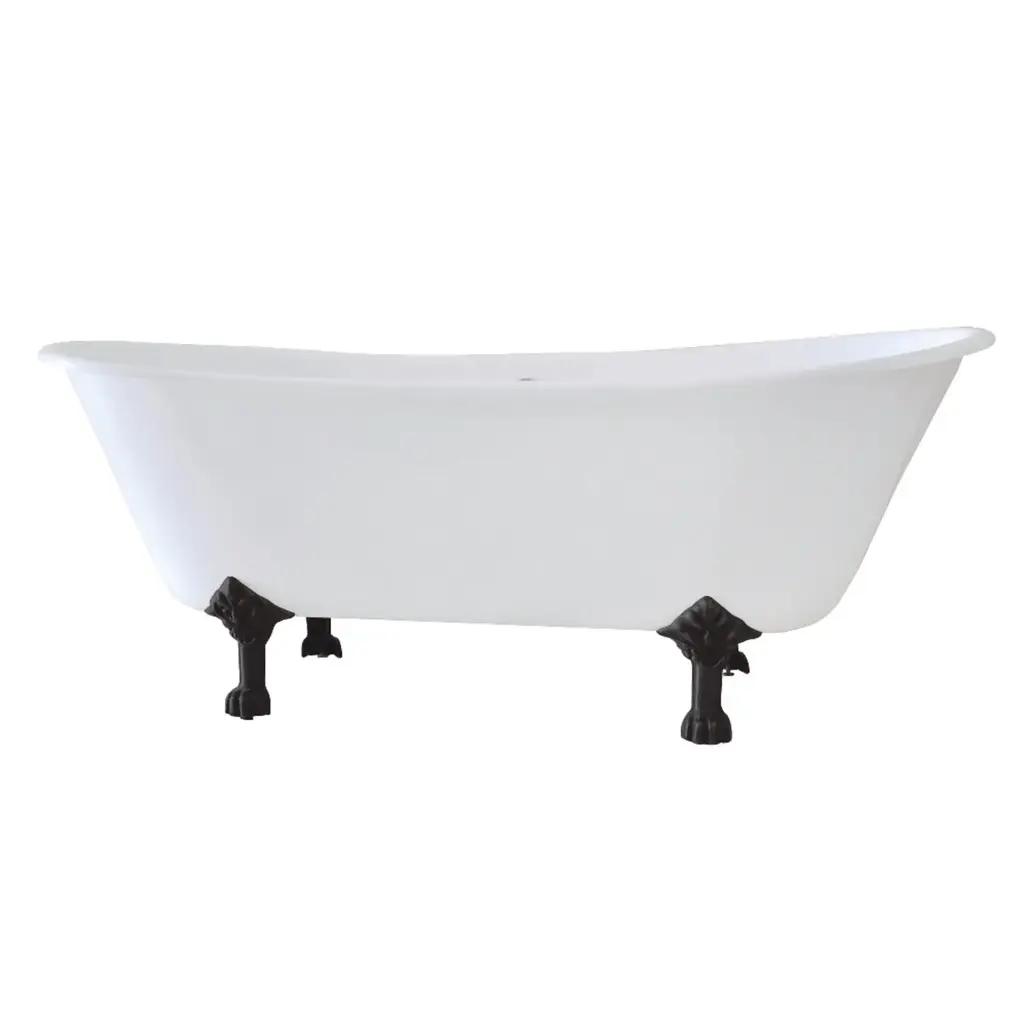 This 61-inch slipper cast-iron bathtub is perfect for those who want to place a tub in a smaller space and still enjoy all the benefits cast iron has to offer. The heavy duty cast iron construction not only makes this tub very durable, but will keep your water warm for a very long time. Without faucet deck drillings, a freestanding or wall-mounted faucet can be installed to fill the bathtub. Tub includes a set of Eagle Claw and Ball tub feet.Kingston Brass NHVCTND653129B Features:Tub Specifications:
