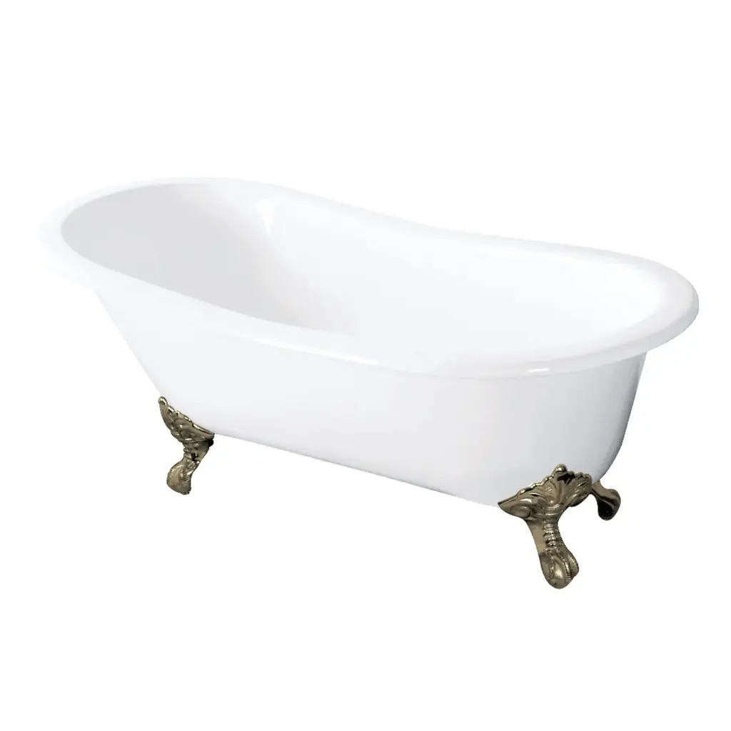 This 61-inch slipper cast-iron bathtub is perfect for those who want to place a tub in a smaller space and still enjoy all the benefits cast iron has to offer. The heavy duty cast iron construction not only makes this tub very durable, but will keep your water warm for a very long time. Without faucet deck drillings, a freestanding or wall-mounted faucet can be installed to fill the bathtub. Tub includes a set of Eagle Claw and Ball tub feet.Kingston Brass NHVCTND653129B Features:Tub Specifications: