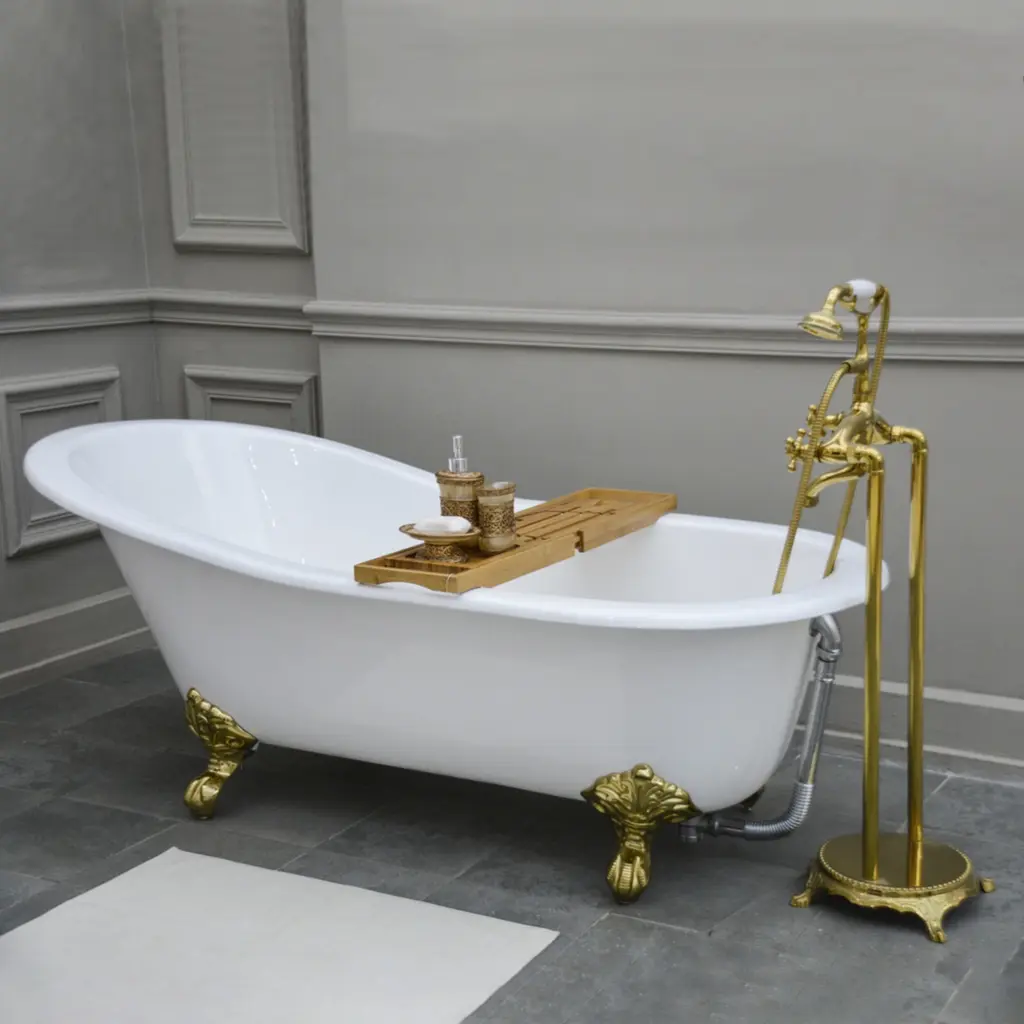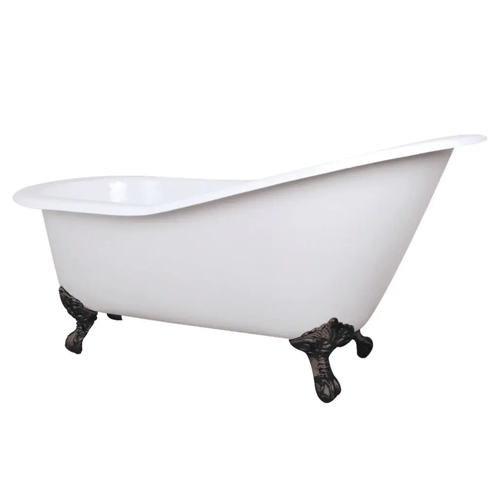 Surround yourself with the perfumed aroma of your favorite candle, grab your favorite piece of literature, and soak all of the stresses of the day away with the all-encompassing embrace of one of Kingston Brass' finest products, the clawfoot tub. Since the late 19th century, the claw foot tub has stood prominent among bathroom fixtures for its outstanding grandeur. The Aqua Eden 61-inch cast iron slipper clawfoot tub will wholly beautify your home for years to come thanks to its durable and heavy cast iron construction. Elegantly crafted clawfoot tub feet are included to further elevate your home's traditional eminence. Aside from its feet, this bathtub is enameled in glossy white for a classic look, exceptional durability, and easy care and maintenance for years to come.FeaturesFabricated from high quality cast iron materialFreestanding installationOverall dimension: (L)61-9/16" x (W1)30-1/2" x (W2)29-1/2" x (H1)27-11/16" x (H2)22-5/8"Water depth is 14" to overflow41.5 gallon tub capacitySingle slipper tub for added comfortNo faucet drillingsFreestanding and wall mount tub filler readyReversible/end drain placementBathtub (but not feet) finished in glossy white enamel on all sides and rimBuilt-in adjuster on tub feet for uneven floorsEagle claw & ball design