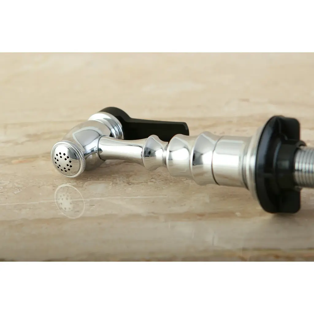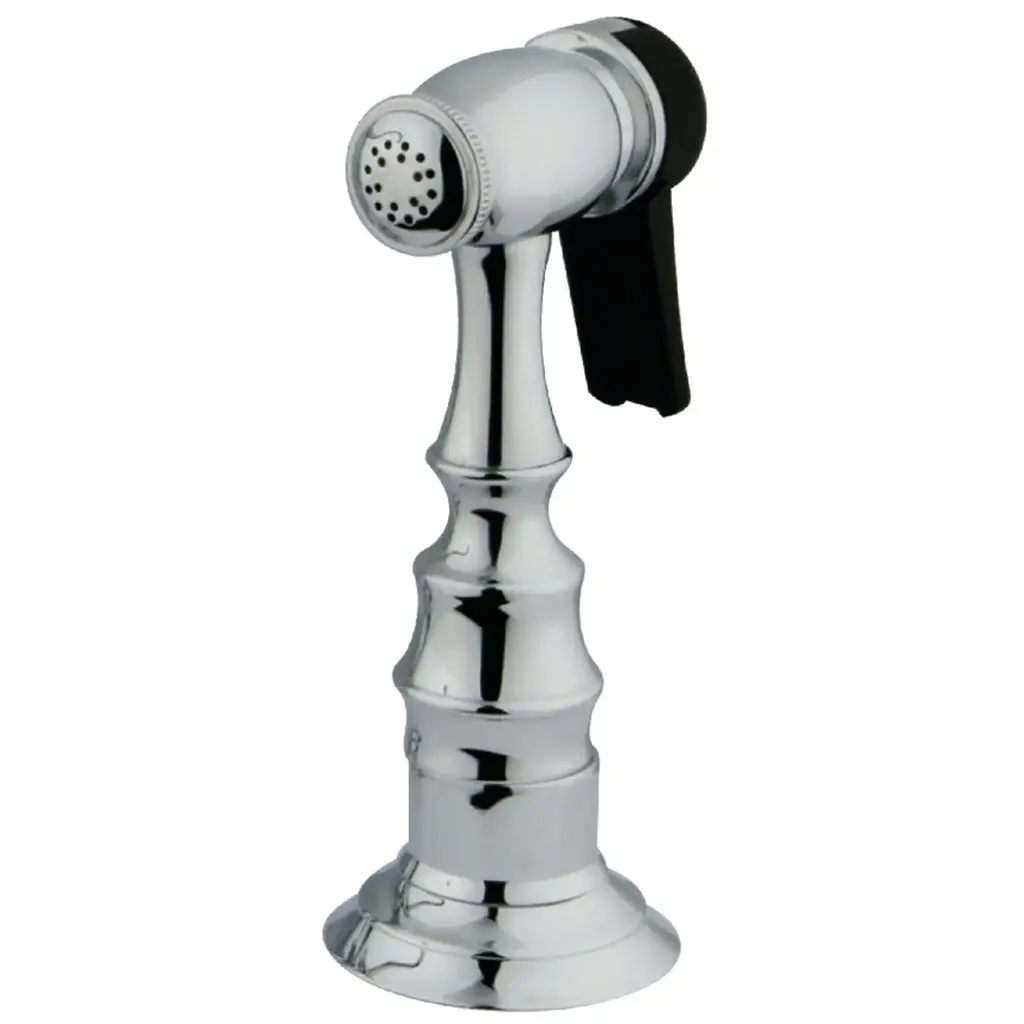 The Kingston Brass kitchen side spray, constructed of brass, can be used to replace or in select instances upgrade or update your kitchen faucet's existing side spray. This item can only be used with side spray compatible faucets and should not be installed in alternate configurations. Available in multiple finishes to match your faucet. Includes 48" black hose sheathed in braided nylon for durability and cleaning chemical resistance.FeaturesHigh quality brass construction2-1/8" shank height fit to most countertopIncludes 48-inch black braided nylon hose1/4-18 NPS connectionSingle spray functionEasy-to-use one-touch button operationCorrosion-resistant finishDesigned for long-lasting durabilityTo be used as a replacement for an existing side spray on a compatible kitchen faucetNever to be installed directly to a supply line, stop valve or other continuous pressure source