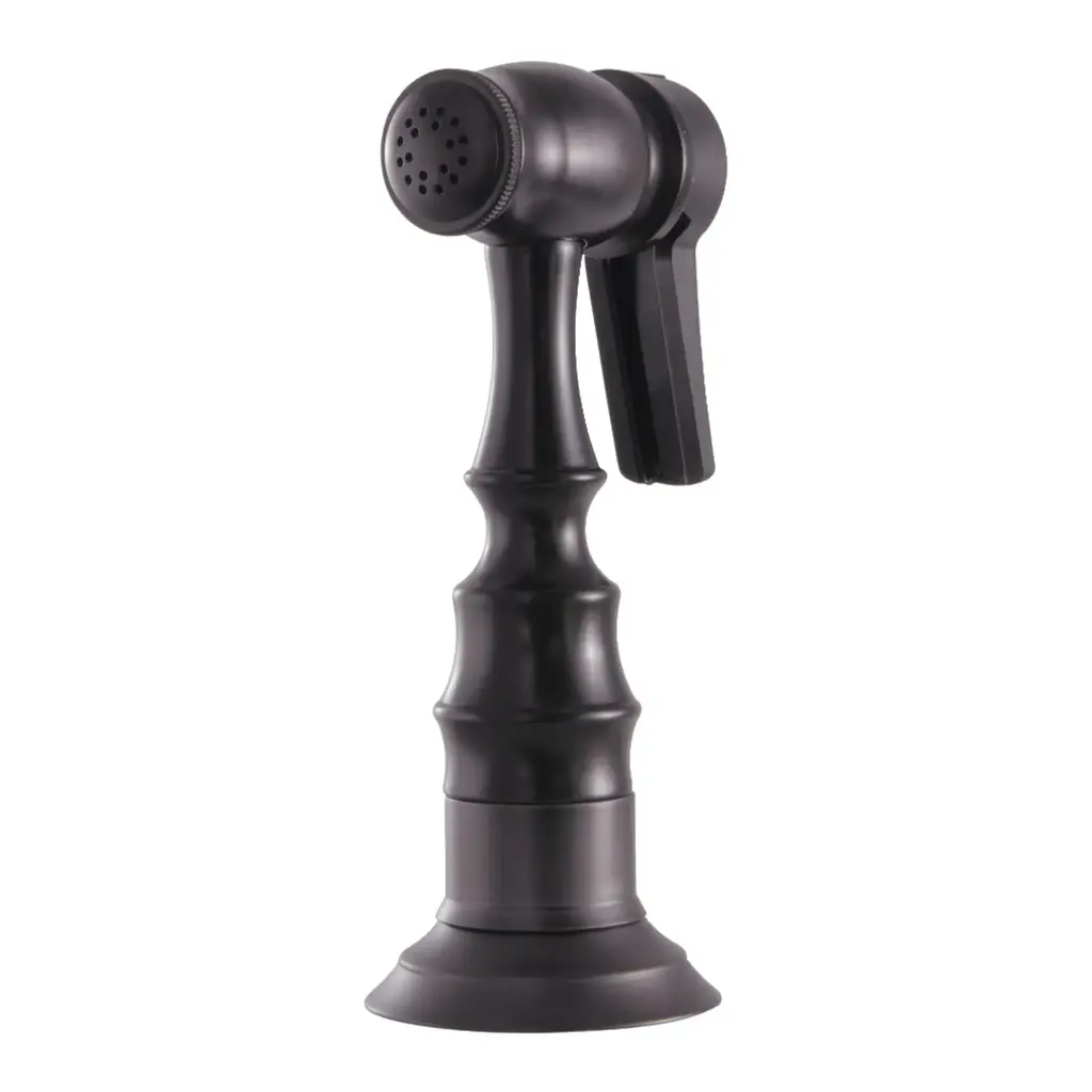 The Kingston Brass kitchen side spray, constructed of brass, can be used to replace or in select instances upgrade or update your kitchen faucet's existing side spray. This item can only be used with side spray compatible faucets and should not be installed in alternate configurations. Available in multiple finishes to match your faucet. Includes 48" black hose sheathed in braided nylon for durability and cleaning chemical resistance.FeaturesHigh quality brass construction2-1/8" shank height fit to most countertopIncludes 48-inch black braided nylon hose1/4-18 NPS connectionSingle spray functionEasy-to-use one-touch button operationCorrosion-resistant finishDesigned for long-lasting durabilityTo be used as a replacement for an existing side spray on a compatible kitchen faucetNever to be installed directly to a supply line, stop valve or other continuous pressure source