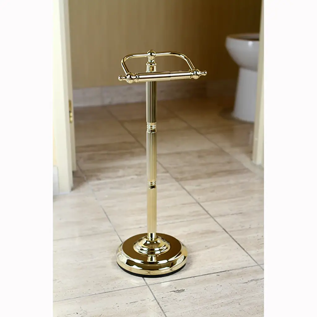 Introduce functionality and style to your bathroom decor with this toilet paper holder by Kingston Brass. The beautiful finish enhances the subtle line detailing along the thin frame and circular base to lend elegant charm and character to your bathroom. Boasting a free-standing design, this toilet paper holder offers convenient placement within arm's reach of your toilet.Free standing toilet paper holderBrass constructionElegant Georgian stylingAvailable with chrome, polished brass, satin nickel, and oil-rubbed bronze finishesColor of oil bronze finish subject to change over time as finish develops its unique patinaStands 22.25 inches high