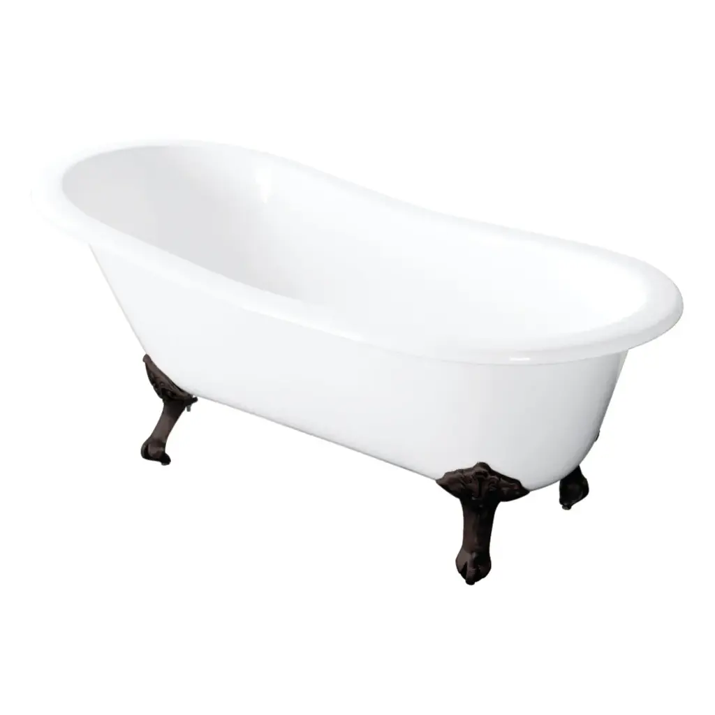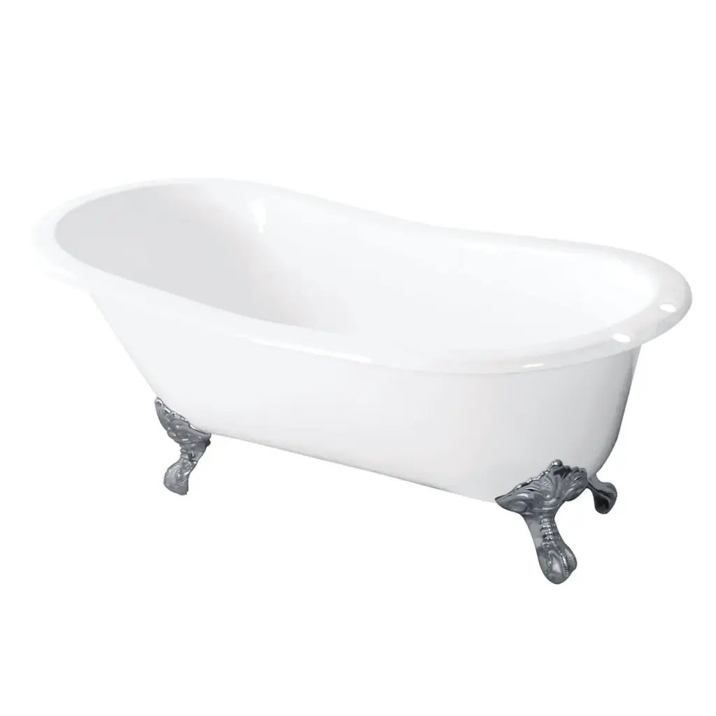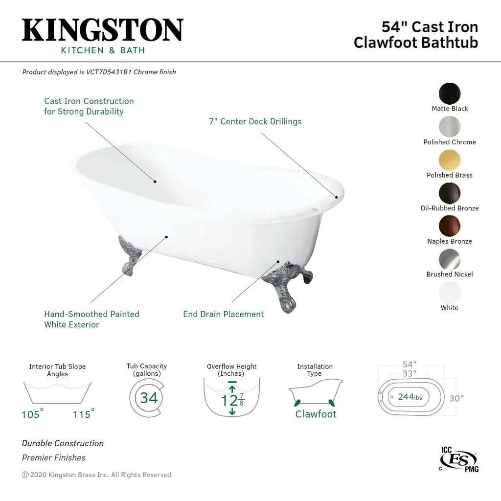 Surround yourself with the perfumed aroma of your favorite candle, grab your favorite piece of literature, and soak all of the stresses of the day away with the all-encompassing embrace of one of Kingston Brass' finest products, the clawfoot tub. Since the late 19th century, the clawfoot tub has stood prominent among bathroom fixtures for its outstanding grandeur. The Aqua Eden 54-inch cast iron slipper clawfoot tub with 7-inch faucet drillings will wholly beautify your home for years to come thanks to its durable and heavy cast iron construction. Elegantly crafted clawfoot tub feet are included to further elevate your home's traditional eminence.Kingston Brass VCT7D5431B Features:Tub Specifications: