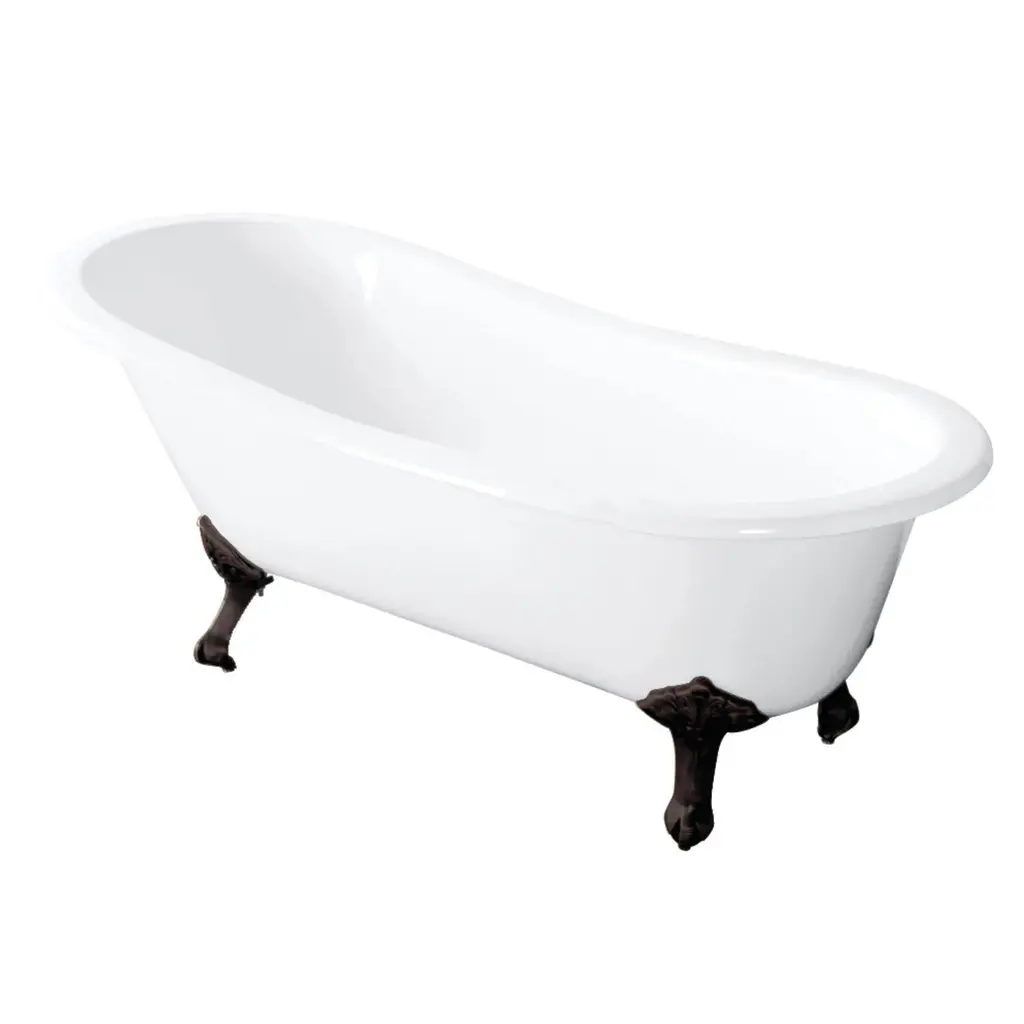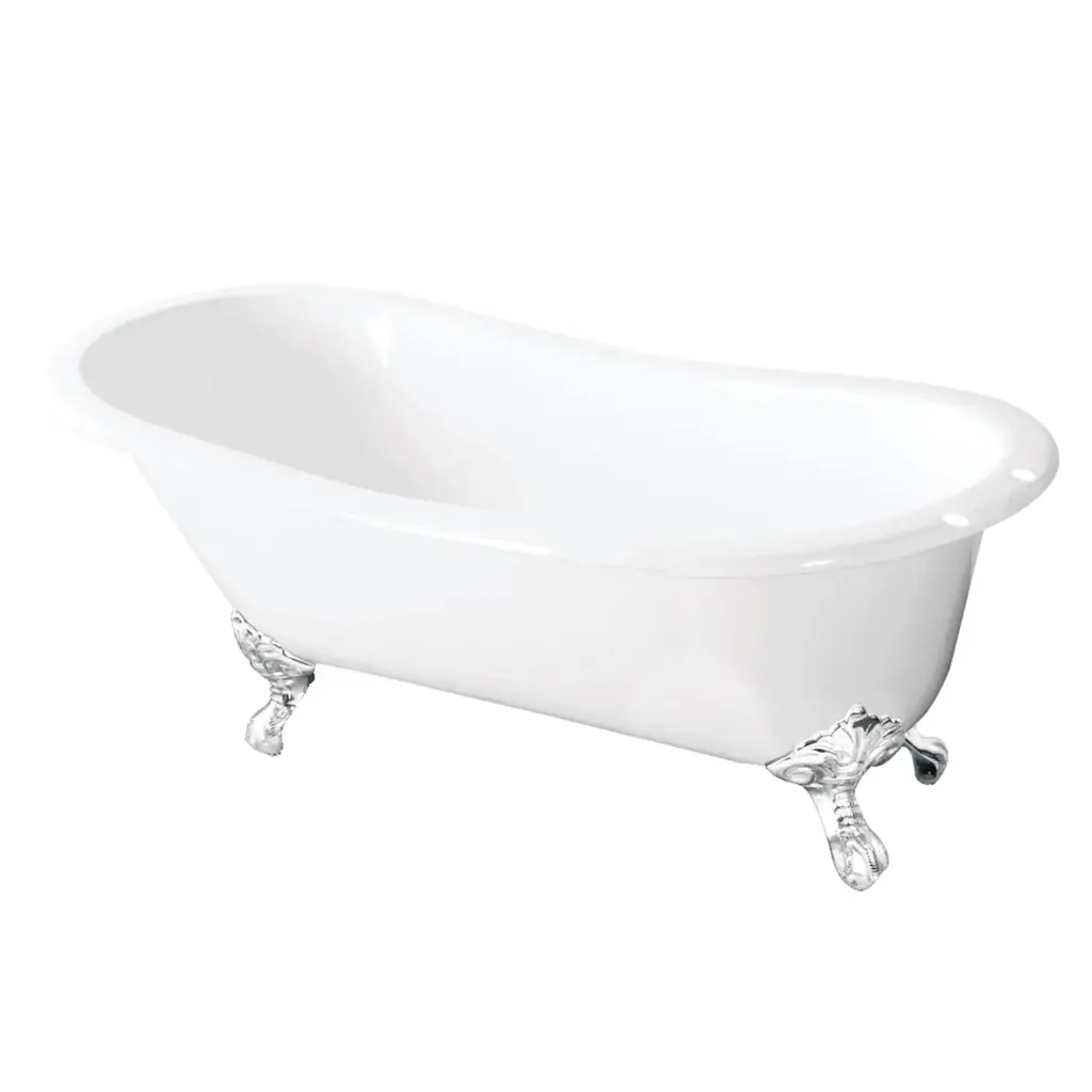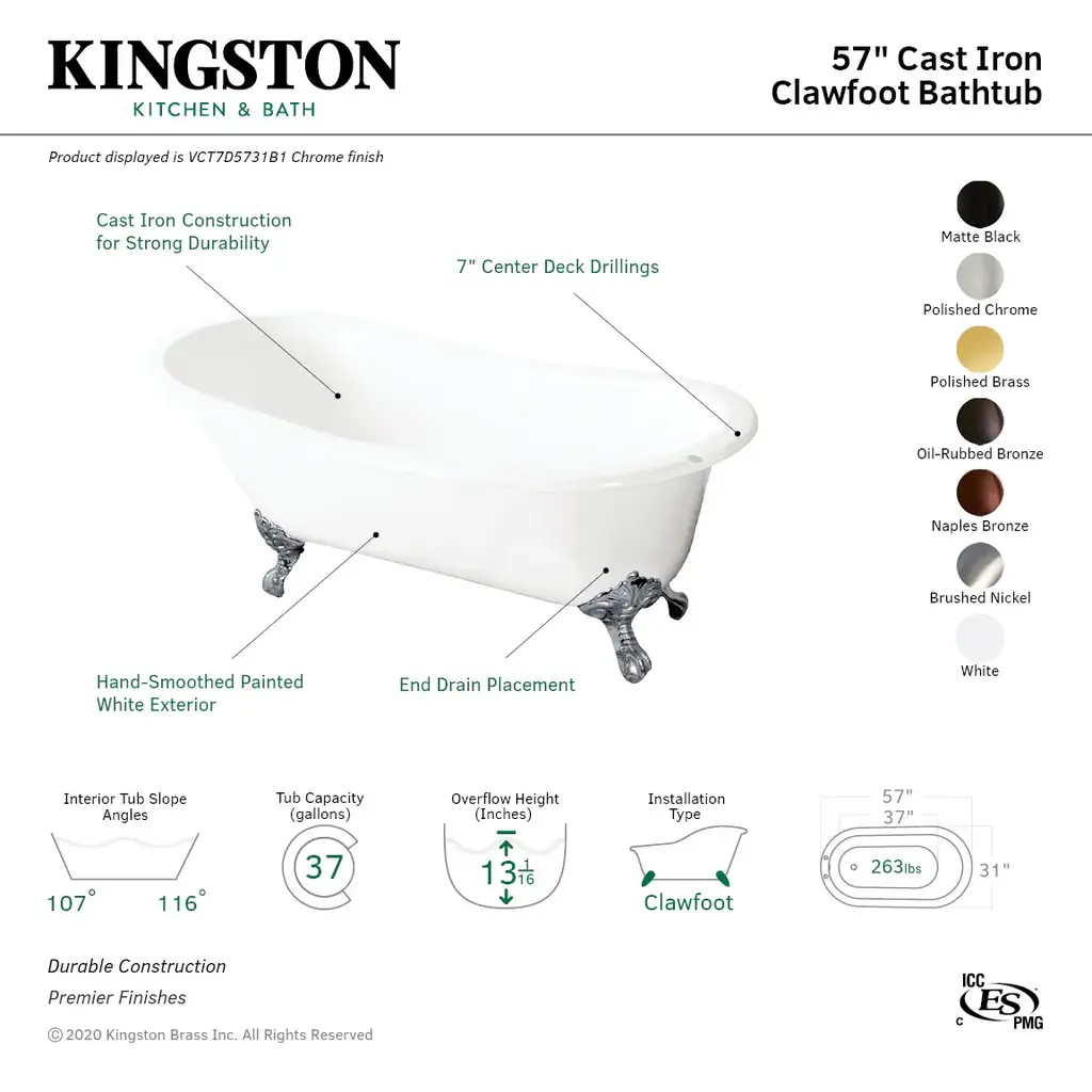 Surround yourself with the perfumed aroma of your favorite candle, grab your favorite piece of literature, and soak all of the stresses of the day away with the all-encompassing embrace of one of Kingston Brass' finest products, the clawfoot tub. Since the late 19th century, the clawfoot tub has stood prominent among bathroom fixtures for its outstanding grandeur. The Aqua Eden 57-inch cast iron slipper clawfoot tub with 7-inch faucet drillings will wholly beautify your home for years to come thanks to its durable and heavy cast iron construction. Elegantly crafted clawfoot tub feet are included to further elevate your home's traditional eminence.Kingston Brass VCT7D5731B Features:Tub Specifications: