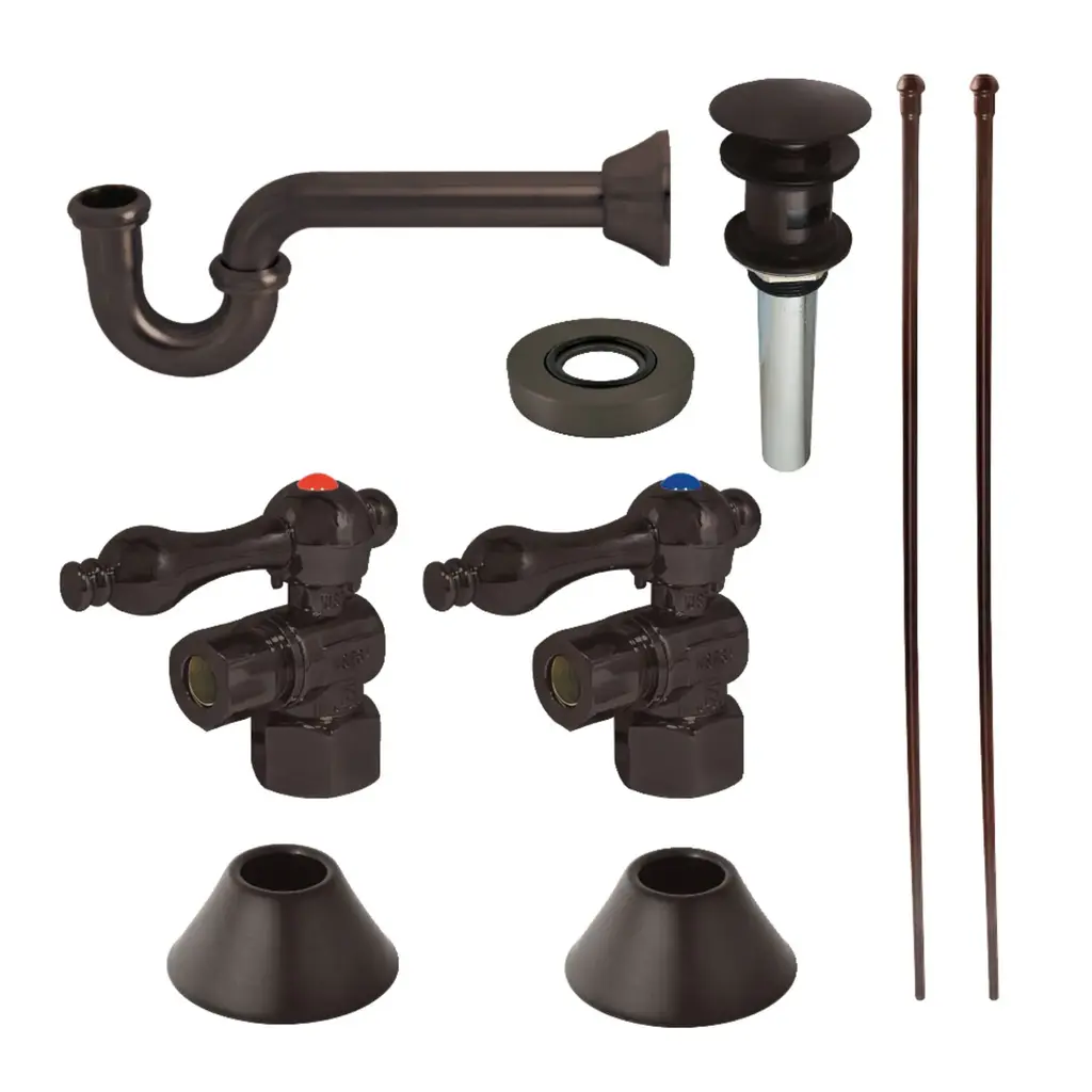 This traditional style vessel sink plumbing kit consists of all the necessary parts for installing a waste water draining system. The parts included are single handle 1/2" IPS angle stops, 30" bullnose lavatory supply lines, 1/2" IPS bell flanges, a 1-1/4" P-trap and a drain with mounting ring. Constructed of high quality material and a tarnish-resistant finish, designed for long-lasting performance. Available in a variety of stunning finishes ready to match any home decor.FeaturesTwo 1/2"-14 NPT inlet x 3/8" O.D. comp quarter turn angle stop valvesTwo high profile flangesTwo pieces 3/8" x 30" bull nose rigid supply linesOne traditional p-trap w/ flangeOne drain and mounting ring kit for vessel sinkAngle stops include traditional lever handle