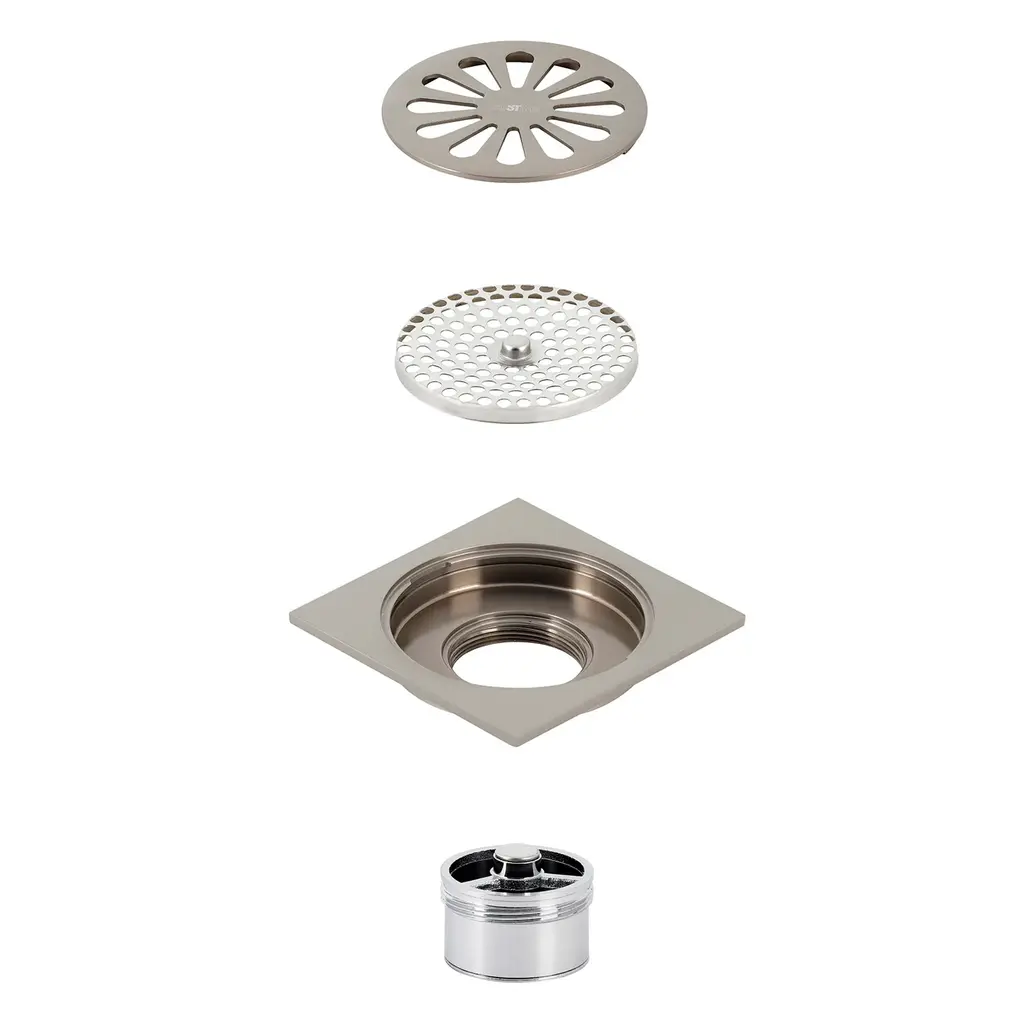 The Watercourse collection features an array of shower drains in multiple finishes. From simple, non-obtrusive grid-cut floor drains to ornate embossed floral patterns the Watercourse collection offers a range of selections. Watercourse drains install a variety of ways and fit a range of both square and circular drain openings. Please see each drain for its detailed specifications and compatibility. The Sunburst drain flange in the Watercourse collection fits a 4" x 4" square and features an array of elongated tear-drop cutouts in a sunburst pattern on its circular hair catcher to prevent foreign objects entering your drain. The design comes in Chrome, Polished Brass, Antique Brass, Oil Rubbed Bronze, Polished Nickel, Brushed Brass, Brushed Nickel and Matte Black to match nearly any fixture and any design.FeaturesSolid brass constructionSquare shower drainOverall dimension: (L)3-15/16" x (W)3-15/16" x (H)1-5/8"Floor installationIncludes cover, dome grid, drain body, and drain core