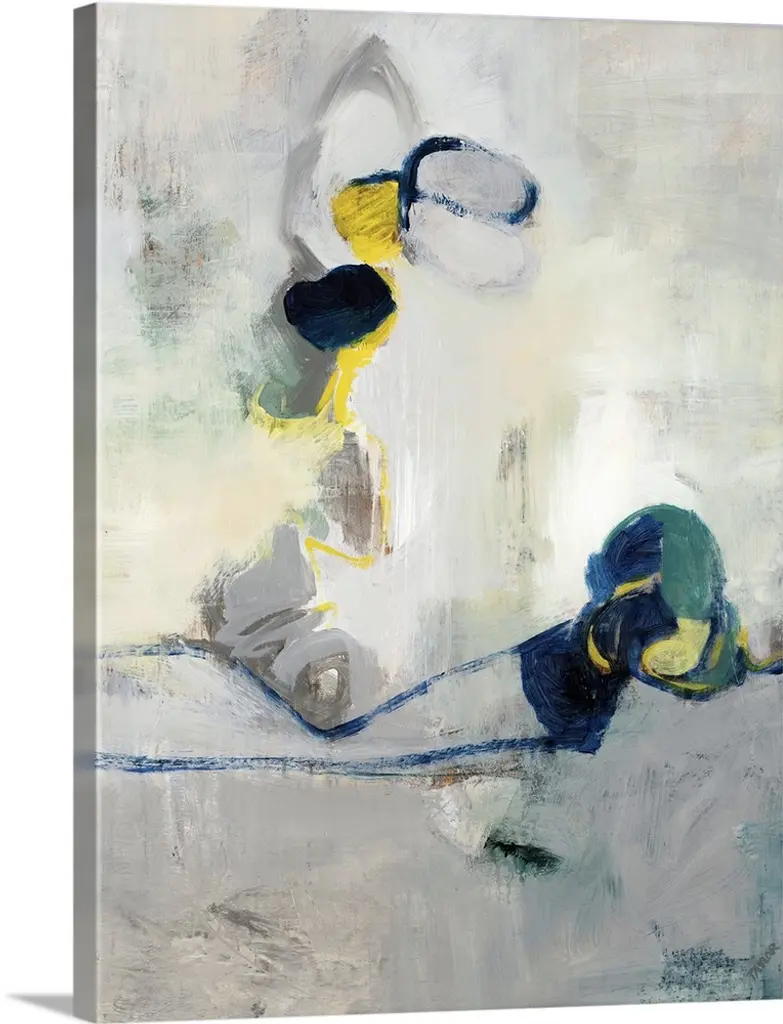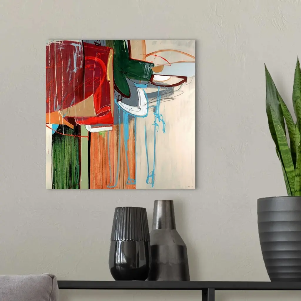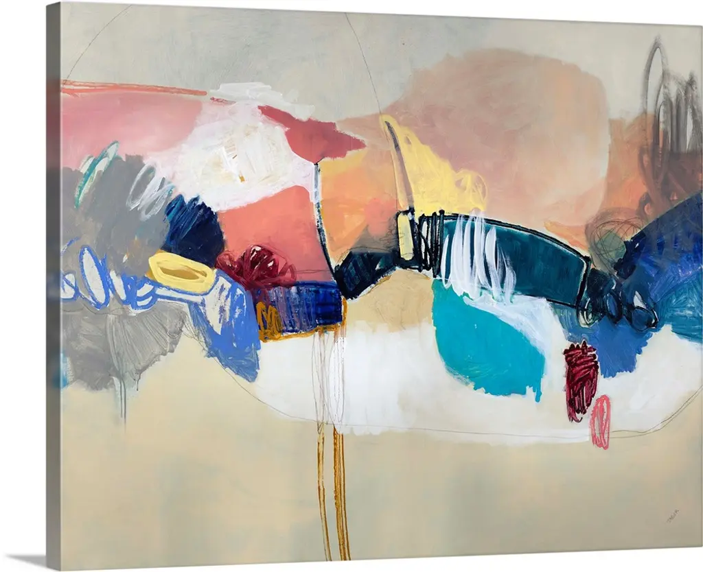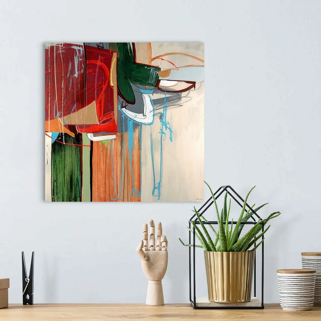 Square, large abstract art of brushed vertical lines in the background, on top in a variety of colors are various shapes and scribbles in a cluster.