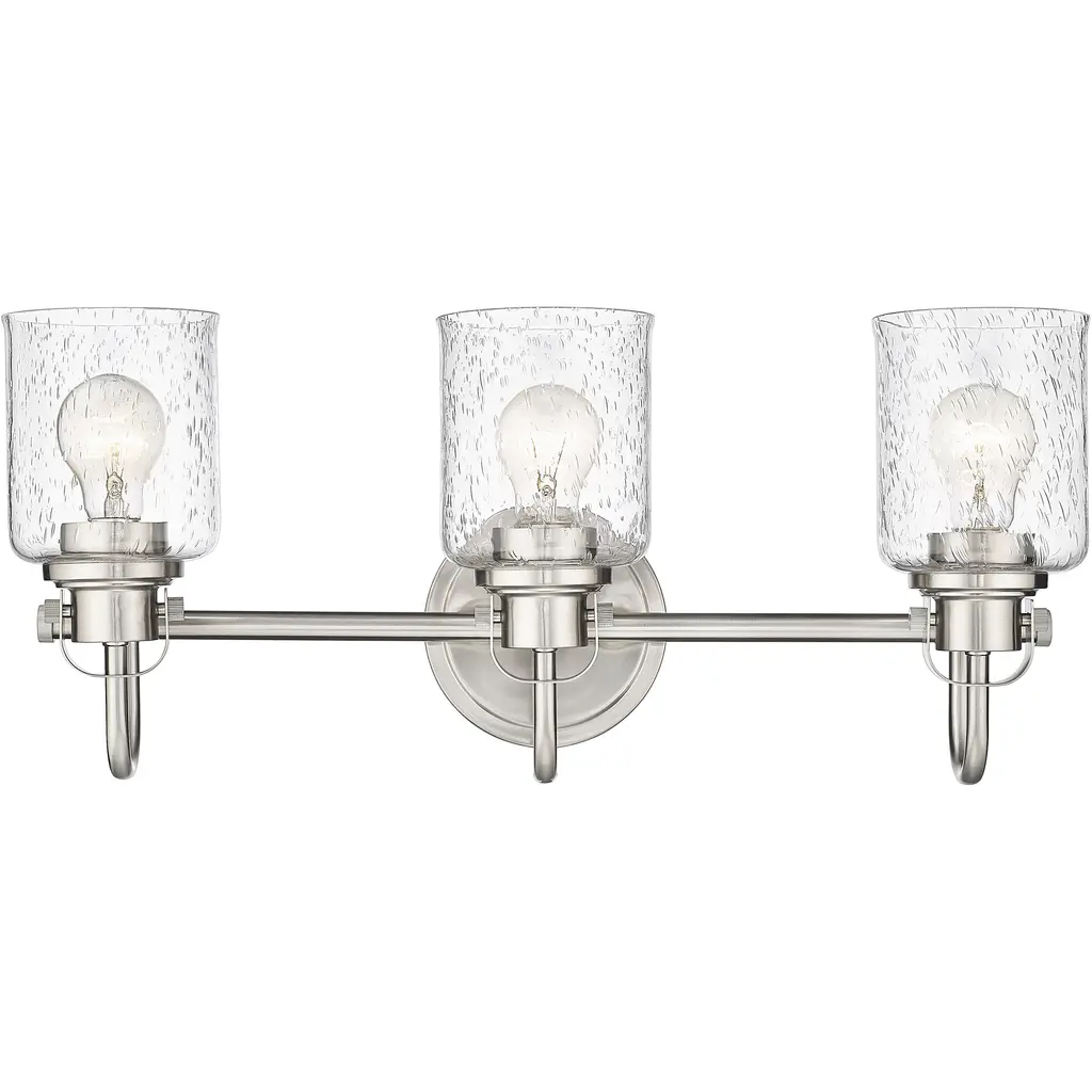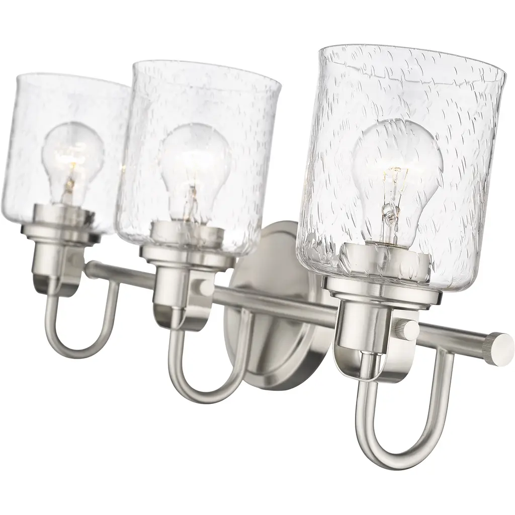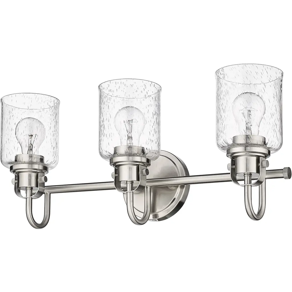 Urban and alluring, this brushed nickel two-light vanity fixture brings a pop of metropolitan flair to any hallway, bedroom or bathroom. Featuring steel construction with a clear seeded glass shade, this wall sconce provides optimal ambient lighting.
