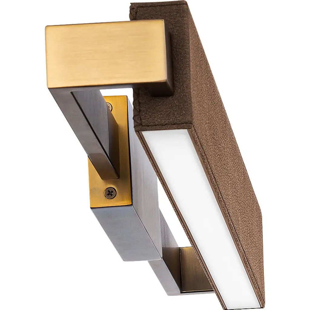 Illuminating couture for interiors. Elegant contrasting pebbled black leather and brushed nickel or combinations of warm brown leather and aged brass exude fashion runway references. This handsome luminaire adds upward and/or downward illumination. Perfect in a formal powder room or mounted over built-in library shelves in a study, this versatile light orients both vertically and horizontally. CCT selectable to choose any of three color temperatures to complement coordinating finishes. Energy efficient integrated LED's provide a long-lasting maintenance-free bright and even illumination throughout any space. NEW: Tri-CCT technology features a switch inside the canopy that is accessible during installation and allows you to toggle color temperatures between 2700K Warm - 3000 Warm White - or 3500K White to find and set the perfect color temperature for your space. This fixture is factory pre-set to 3000K and can be easily modified in the field during installation by the flip of a switch.