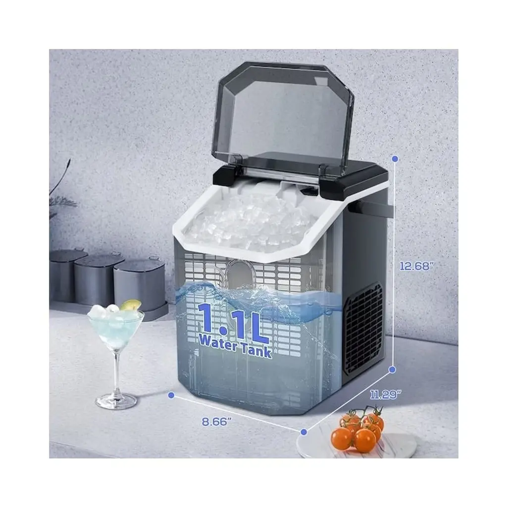 The portable 34 lbs/24 hours nugget ice maker is the easiest and perfect way to bring ice into your home. All you have to do is fill the water tank with 1.1 L water, turn it on, and let it run. Making ice within ONLY 7 minutes, equipped with an ice basket that holds up to 1.5 lbs, and in 24 hours you can make 34 lbs of ice, you are never going to run out of ice! As well, this device produces low decibels and is entirely energy efficient. The self-cleaning function provides you with clean ice, and makes it last to use. It will be the perfect addition to your kitchen. The large window allows you to keep the ice cool while checking on the production. A high-density polyurethane foam layer with good thermal insulation effectively isolates external heat and slows the melting of ice. Unlike traditional hard cubes, our nugget ice is soft and chewable, friendly to the teeth, and suits people of all ages. Its airy texture soaks up your favorite beverage and makes it a joy to chew.