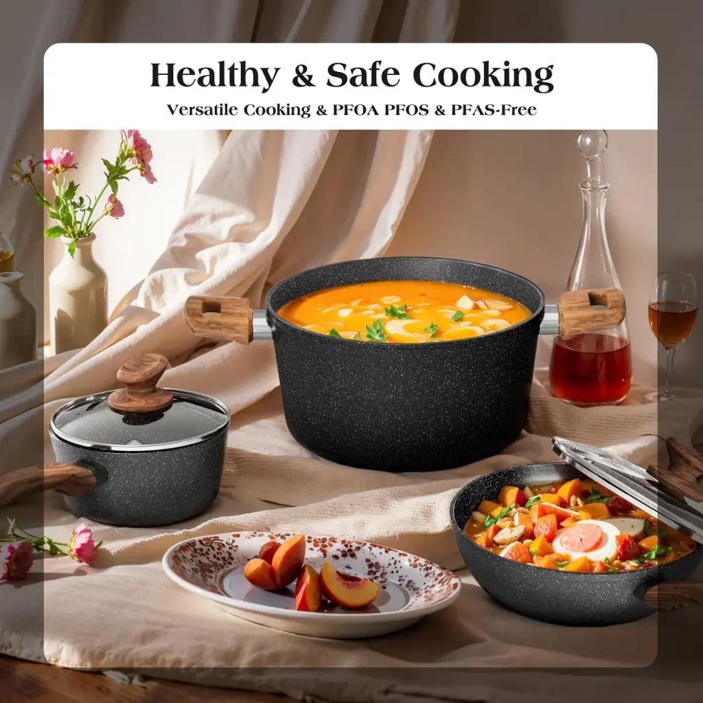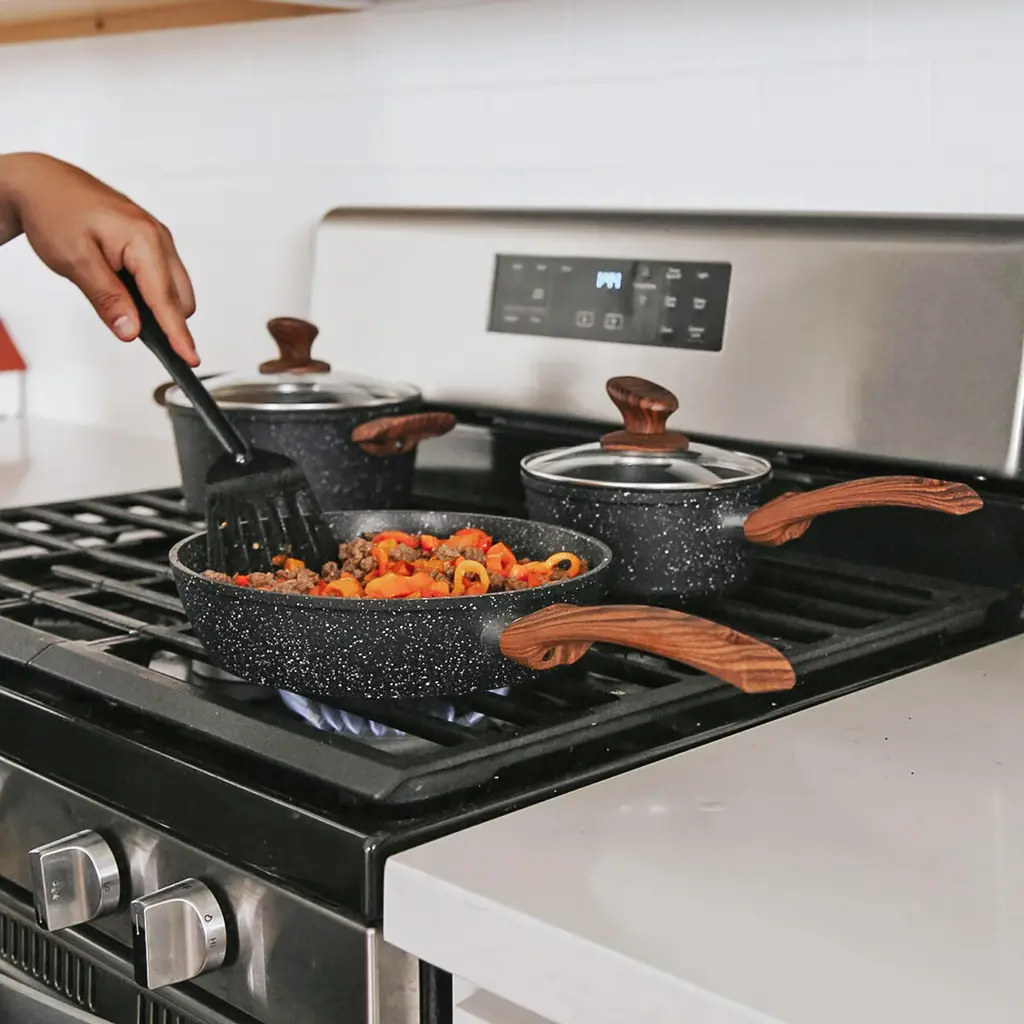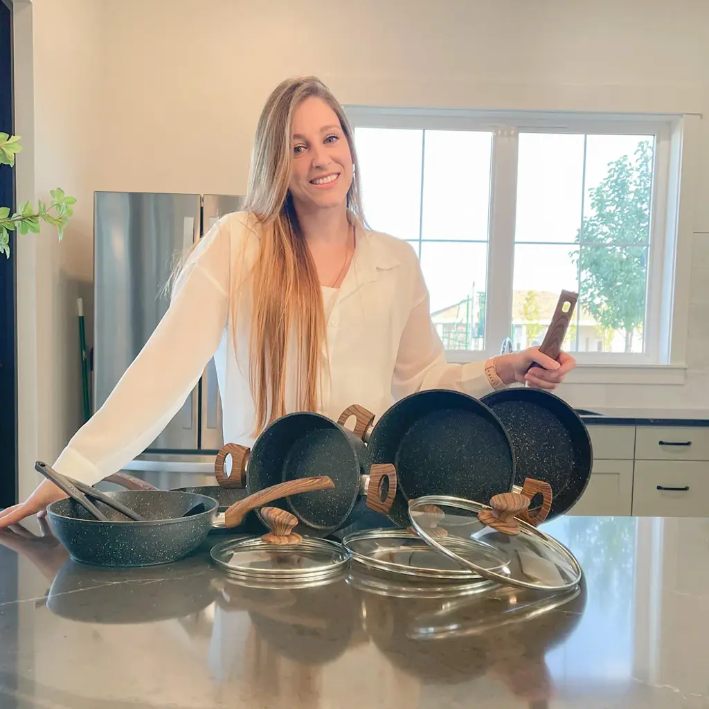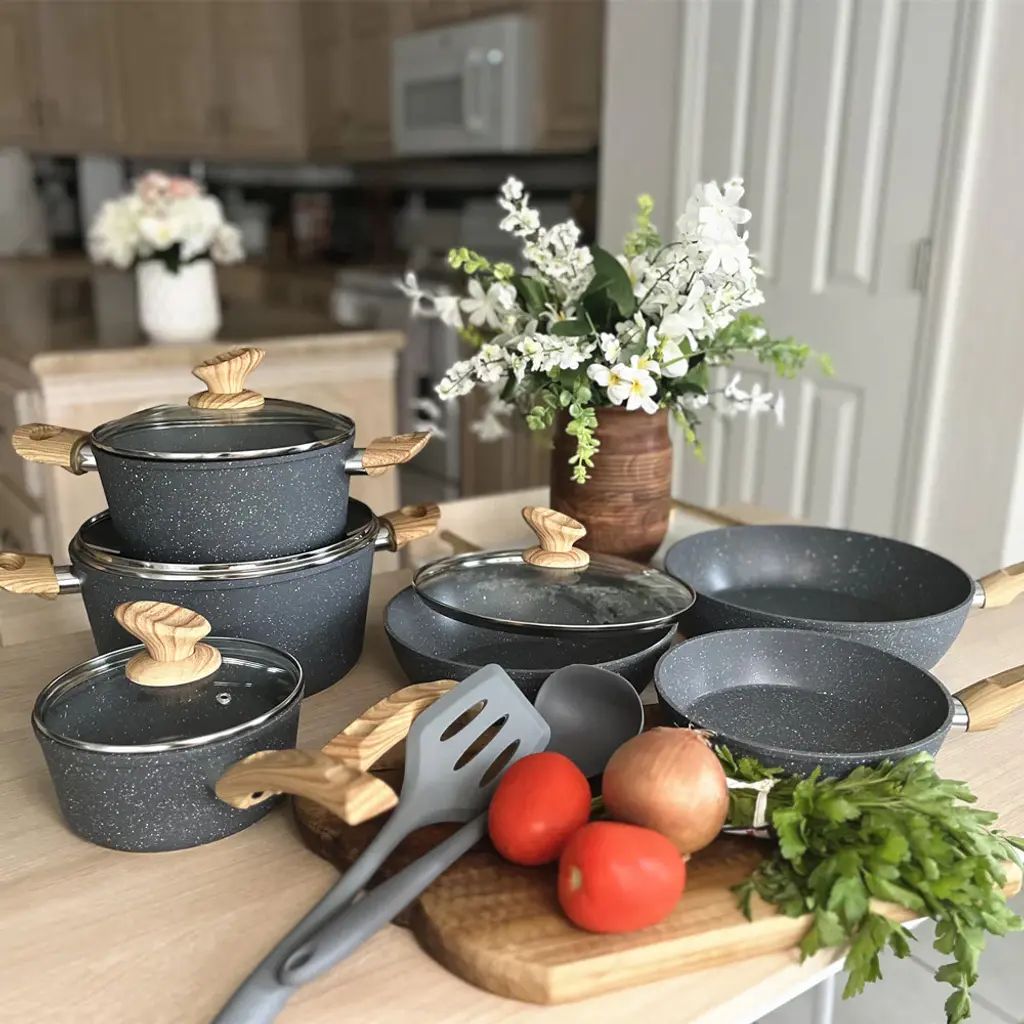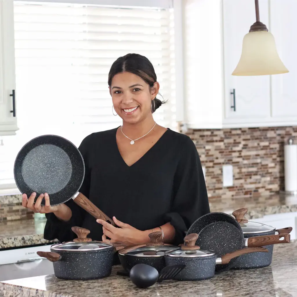 This 12-piece cookware set is offered in three appealing colors, including a vibrant green option that adds a stylish pop to your kitchen decor. With its superb granite coating, this set boasts impressive non-stick capability and is induction-compatible, ensuring safe and versatile cooking, making it ideal for holiday gifting during Thanksgiving and Christmas.