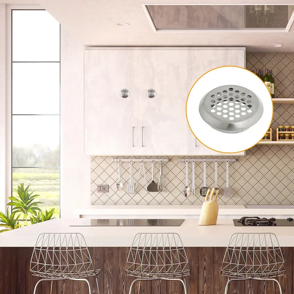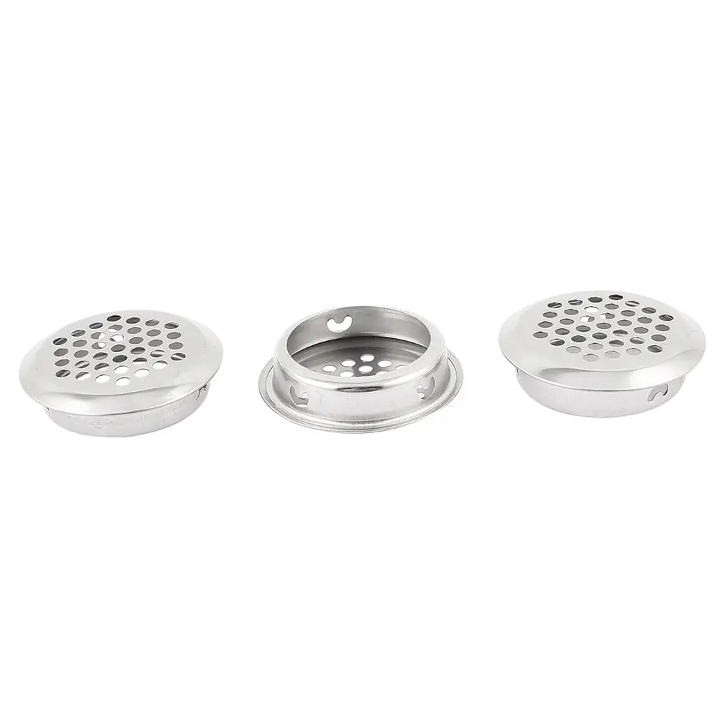 Mounting Hole Size: 3.4 x 0.7cm/1.3" x 0.3"(D*H); Product Name: Air Vent; Color: Silver Tone; Material: MetalTotal Size: 4.15 x 3.4 x 1.1cm/1.6" x 1.3" x 0.4"(Top D*Bottom D*T); Net Weight: 14g; Package Content: 3 x Air VentRound Mesh Design--Stainless Steel Mesh Hole With honeycomb design, round holes conform to the breathable design, small round holes can be dust-proof and not easy to block.Odor-Free Environment— Circular mesh can make the wind easily flow into the spaces where you are staying, it will giving you a fresh and life and work environment.Applications— Applicable for ventilation of cabinet, shoes cabinet, decorative cabinet and offices, meeting rooms, music hall. Not for drain filter.Description:The Air Vent is made of Stainless Steel, durable, and strong ability to withstand gravity, not only oxidation resistance, but also more beautiful installation effect.Stainless steel Mesh Hole With honeycomb design, round holes conform to the breathable design, small round holes can be dust-proof and not easy to block.Circular mesh can make the wind easily flow into the spaces where you are staying, it will giving you a fresh and life and work environment.This vent does not require much effort to install, the same diameter hole can be mounted directly.Applicable for ventilation of cabinet, shoes cabinet, decorative cabinet and offices, meeting rooms, music hall. Not for drain filter.Specification:Product Name: Air VentMaterial: MetalColor: Silver ToneMounting Hole Size: 3.4 x 0.7cm/1.3" x 0.3"(D*H)Mounting Hole Size: 25 x 7mm/1" x 0.28"(D*H)Total Size: 34 x 12mm/1.3" x 0.47"(D*H)Each Hole Dia: 3mm/0.12"