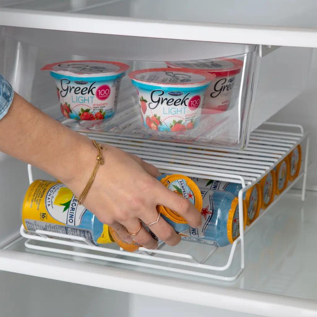 This Kitchen Details' Double Wide Beverage Can Dispenser makes it easy to dispense your favorite drinks from your fridge. Declutters fridge space by holding all of your cans. 2 section design, holds 10 cans in total. Rust resistant coating, durable and long lasting.