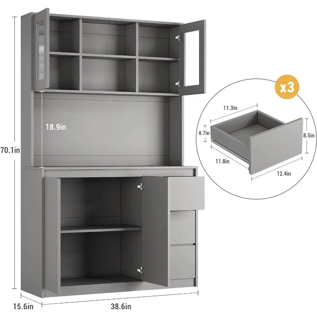 Upgrade your kitchen with the AOILE Kitchen Pantry Cabinet, designed for modern convenience and ample storage. Featuring a spacious countertop, adjustable shelves, and three drawers, this tall pantry keeps your essentials organized and accessible. The built-in charging station with two power outlets and USB ports ensures your microwave, coffee maker, or other devices stay powered while you work. The sleek glass doors and LED lighting add a touch of elegance, making this cabinet ideal for kitchens, dining areas, or even living rooms as a buffet or display unit. Crafted from durable engineered wood in white or black, it seamlessly blends into any interior style, offering both functionality and sophistication.Specifications:Brand: AOILEColor: White / BlackProduct Dimensions: 15.6"D x 38.6"W x 70.1"HMaterial: Engineered WoodMounting Type: Floor MountDoors: 2 Glass DoorsDrawers: 3 Spacious DrawersSpecial Features: LED Lights, Adjustable Shelves, Charging Station (2 Power Outlets, 2 USB Ports)