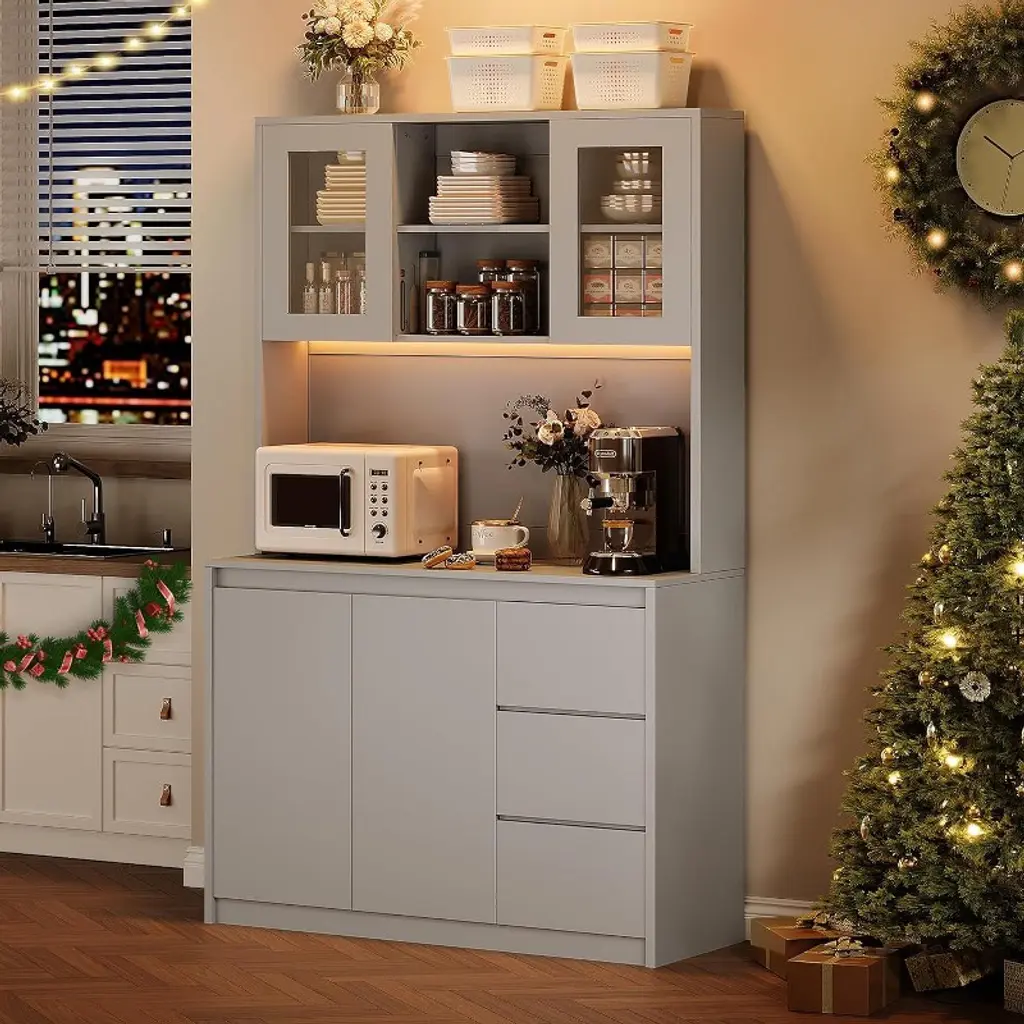Kitchen Pantry Cabinet With Charging Station, Led Lights & Glass Doors, Tall Storage Cabinet,gray