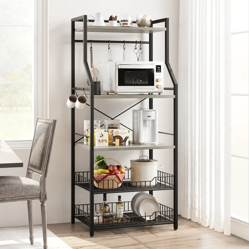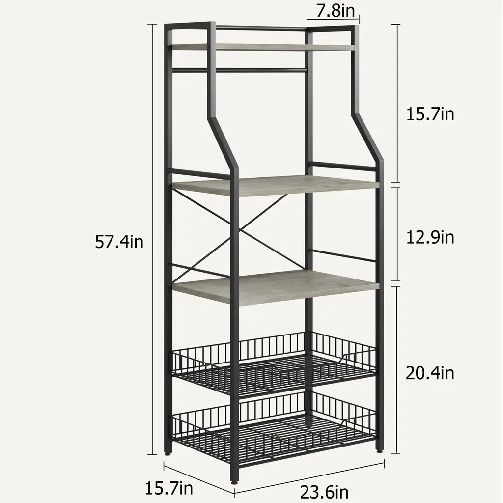 Stable and Secure: The adjustable feet and anti-tip kit enhance overall stability help balance out small irregularities and prevent scratches on the floor. X-bracing prevents the shelf from wobbling or separating apart. Super Sturdy and Durable Construction: Constructed of high-grade MDF board and thickened steel frame and pipe wall, this rustic microwave stand is long-lasting and you can count on it to be a favorite for years to come. Large Storage Capacity: The 5-tier grey microwave stand has 2 large counter tops, 1 top shelf, and 2 metal wire baskets with 8 hooks, providing you with plenty of space to place the microwave oven, bread machine, juicers, toaster, pots, and pans, spices, fruits, vegetable and other supplies. It meets the diversified needs of kitchen storage. Multipurpose Kitchen Storage Shelf: This rustic baker rack combines a coffee bar table, buffet table, and storage racks to give you plenty of storage space. Ideally, it is your microwave stand, coffee bar station, snack rack, or spice rack organizer to support your kitchen goods. This coffee bar table is designed to organize your kitchen groceries neatly.