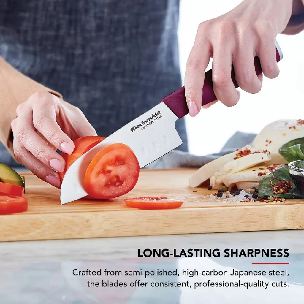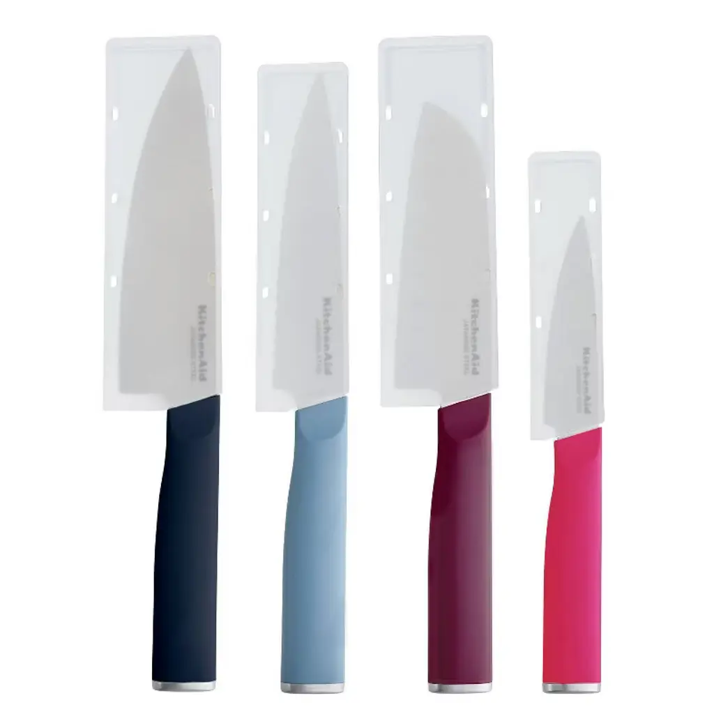 This KitchenAid Classic 4-piece chef set includes all the essential cutlery needed to perform everyday food prep tasks such as slicing, cutting, chopping, mincing, trimming, and more. Use the 6-inch chef knife to chop, the 5-inch santoku knife to dice and mince, the 5.5-inch serrated utility knife to cut through delicate crust, and the 3.5-inch paring knife to peel, trim and garnish small fruits and vegetables. Blades are expertly crafted using semi-polished, high-carbon Japanese steel, hardened and tempered to provide a long-lasting edge for a professional, quality cut every time. These KitchenAid knives feature Eastern-style ergonomic handles that provide optimal control for everyday use. Handles are expertly engineered with a textured finish for a comfortable grip and accented with a chrome endcap. Includes custom-fit blade covers for secure, safe storage. KitchenAid knives are top-rack dishwasher safe. To extend the life of your cutlery, hand washing is recommended. Dry immediately.