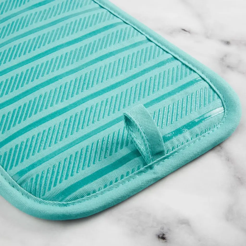 Use the KitchenAid Albany Pot Holders 2-Pack in Aqua Sky to protect your hands from the heat when handling hot pots, pans, and dishes. These matching pot holders each measure 7 inches wide by 10 inches long and feature a slide pocket for your hand for easy on-and-off use. The heavy-duty, 100% cotton fabric offers comfort, flexibility, and insulation. Printed silicone grips are heat resistant and ensure a more secure grip. This set is machine washable for easy care.