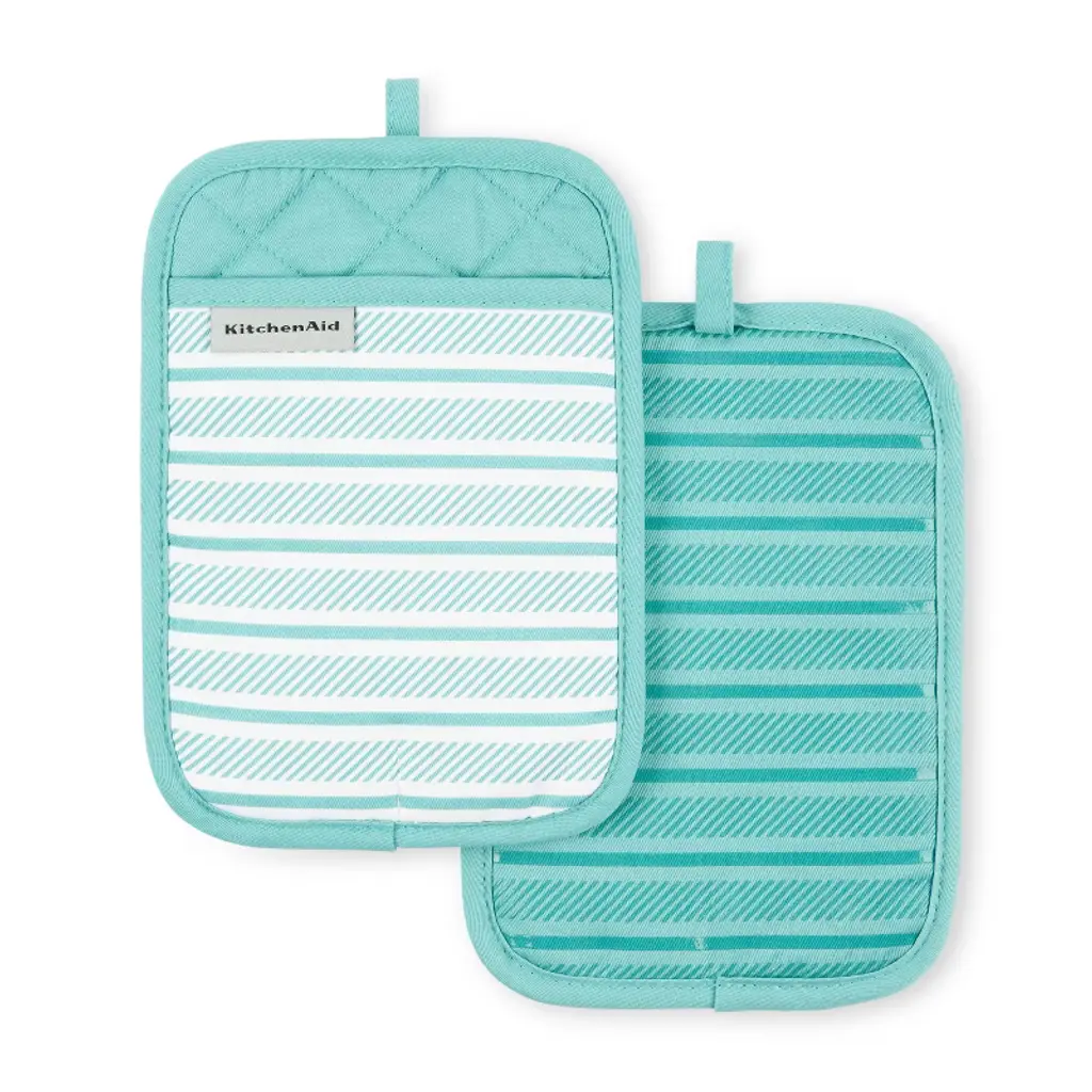 Use the KitchenAid Albany Pot Holders 2-Pack in Aqua Sky to protect your hands from the heat when handling hot pots, pans, and dishes. These matching pot holders each measure 7 inches wide by 10 inches long and feature a slide pocket for your hand for easy on-and-off use. The heavy-duty, 100% cotton fabric offers comfort, flexibility, and insulation. Printed silicone grips are heat resistant and ensure a more secure grip. This set is machine washable for easy care.