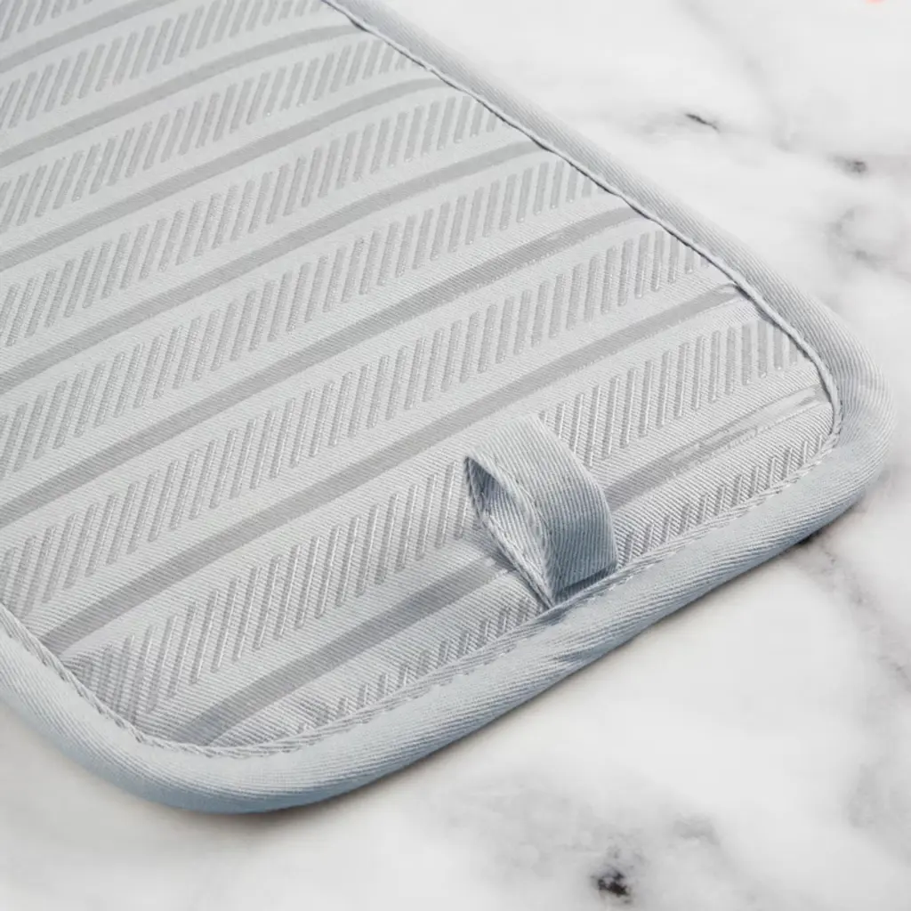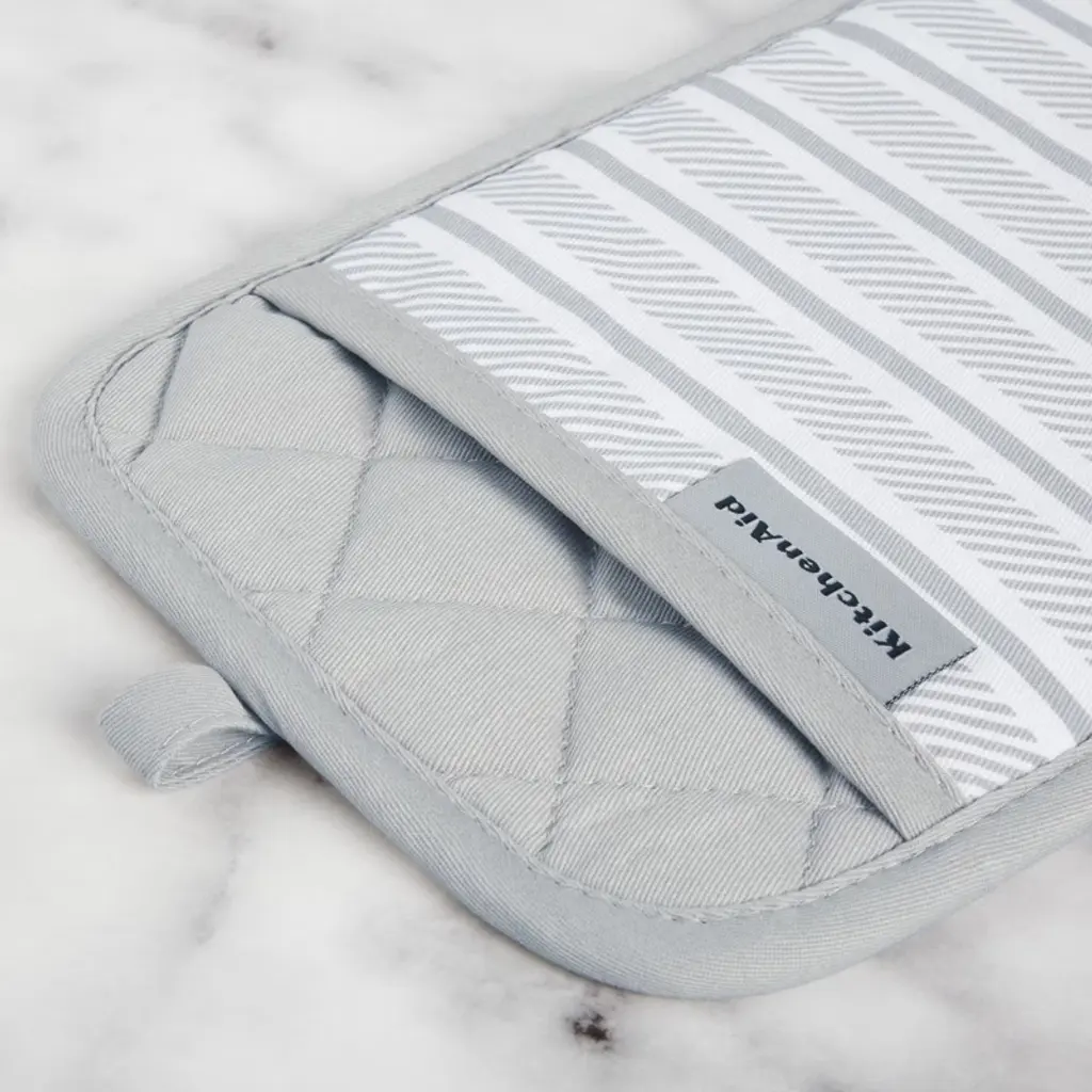 Use the KitchenAid Albany Pot Holders 2-Pack in Aqua Sky to protect your hands from the heat when handling hot pots, pans, and dishes. These matching pot holders each measure 7 inches wide by 10 inches long and feature a slide pocket for your hand for easy on-and-off use. The heavy-duty, 100% cotton fabric offers comfort, flexibility, and insulation. Printed silicone grips are heat resistant and ensure a more secure grip. This set is machine washable for easy care.