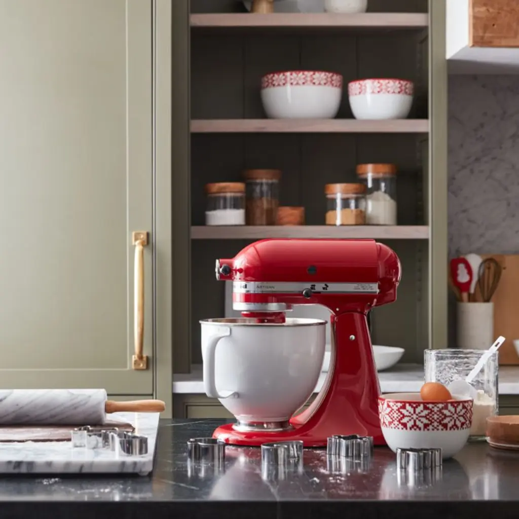 Energize your kitchen decor with KitchenAid's Artisan Series stand mixer in gleaming red. A coveted classic for a reason, the mixer boasts a handled stainless steel bowl that accommodates enough batter to make up to nine dozen cookies at one time. And you can add attachments to shred chicken, churn ice cream or roll out fresh pasta. KitchenAid's heavy-duty power and planetary mixing action spiral the beater to 59 touch points for quick and complete mixing, and the 10-speed control provides settings from very slow stirring to gentle kneading to fast beating. The tilt-head design and easy-install pouring shield make adding ingredients easy and mess-free, while the included wire whip, flat beater and dough hook can handle any recipe. This timeless mixer offers versatility and time-tested durabilityand looks stunning on your kitchen counter.KitchenAid has been crafting high-quality kitchenware for over a century.
