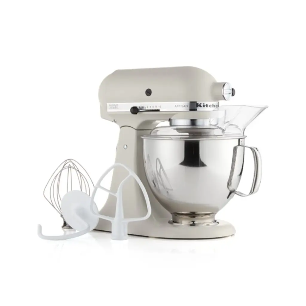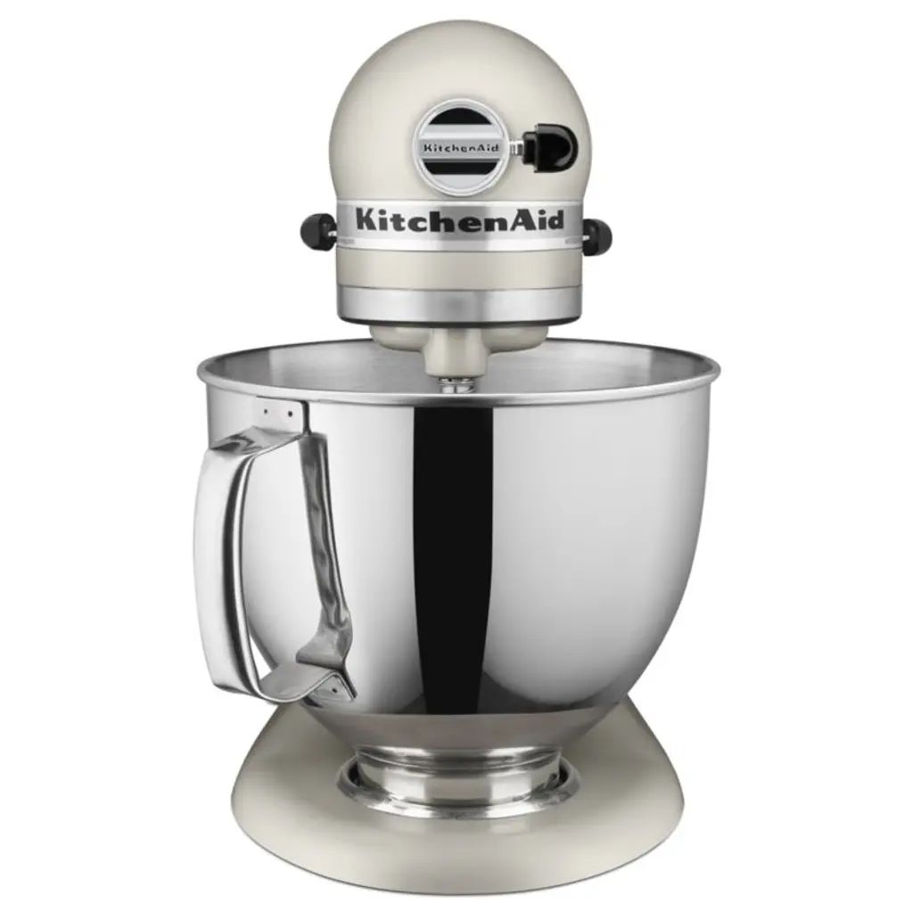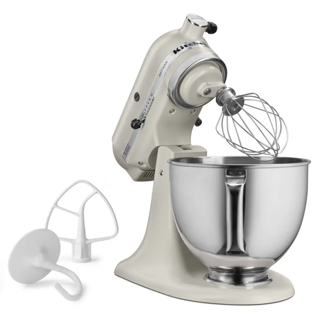 Enamelled in milkshake-inspired warm white, this KitchenAid Artisan Series stand mixer brings beauty and function to the kitchen. A coveted classic for a reason, the mixer boasts a handled stainless steel bowl that accommodates enough batter to make up to nine dozen cookies at one time. And you can add attachments to shred chicken, churn ice cream or roll out fresh pasta. KitchenAid's heavy-duty power and planetary mixing action spiral the beater to 59 touch points for quick and complete mixing, and the 10-speed control provides settings from very slow stirring to gentle kneading to fast beating. The tilt-head design and easy-install pouring shield make adding ingredients easy and mess-free, while the included wire whip, flat beater and dough hook can handle any recipe. This timeless mixer offers versatility and time-tested durabilityand looks stunning on your kitchen counter.KitchenAid has been crafting high-quality kitchenware for over a century.