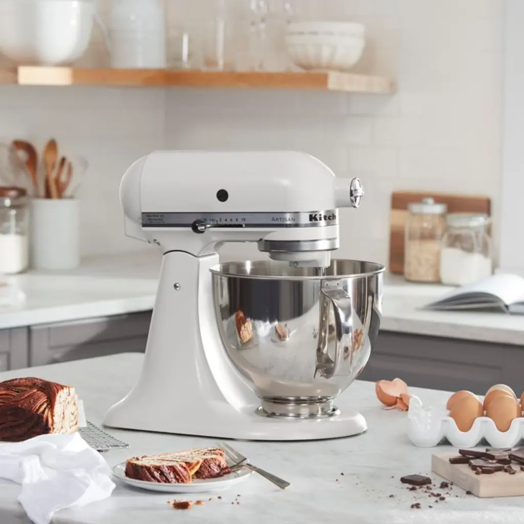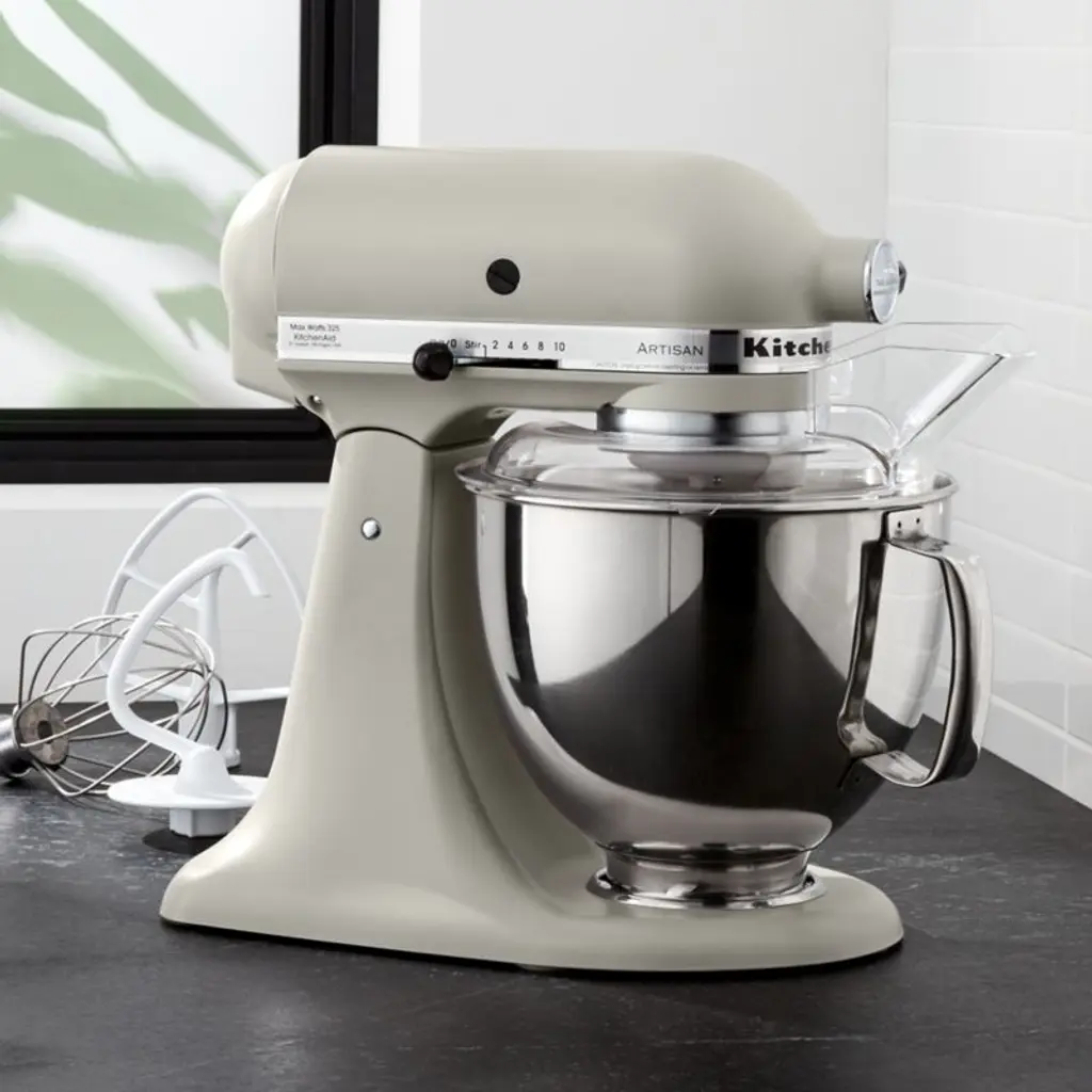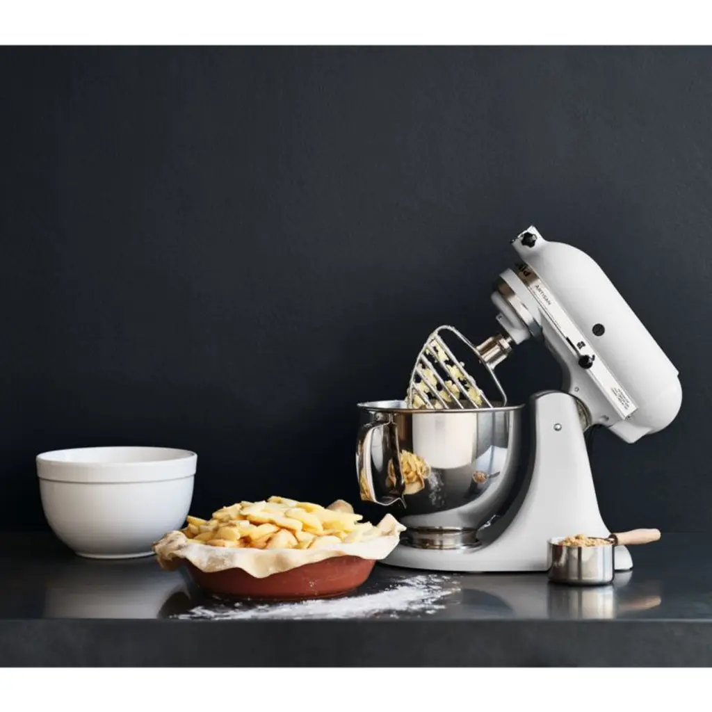 Enamelled in milkshake-inspired warm white, this KitchenAid Artisan Series stand mixer brings beauty and function to the kitchen. A coveted classic for a reason, the mixer boasts a handled stainless steel bowl that accommodates enough batter to make up to nine dozen cookies at one time. And you can add attachments to shred chicken, churn ice cream or roll out fresh pasta. KitchenAid's heavy-duty power and planetary mixing action spiral the beater to 59 touch points for quick and complete mixing, and the 10-speed control provides settings from very slow stirring to gentle kneading to fast beating. The tilt-head design and easy-install pouring shield make adding ingredients easy and mess-free, while the included wire whip, flat beater and dough hook can handle any recipe. This timeless mixer offers versatility and time-tested durabilityand looks stunning on your kitchen counter.KitchenAid has been crafting high-quality kitchenware for over a century.
